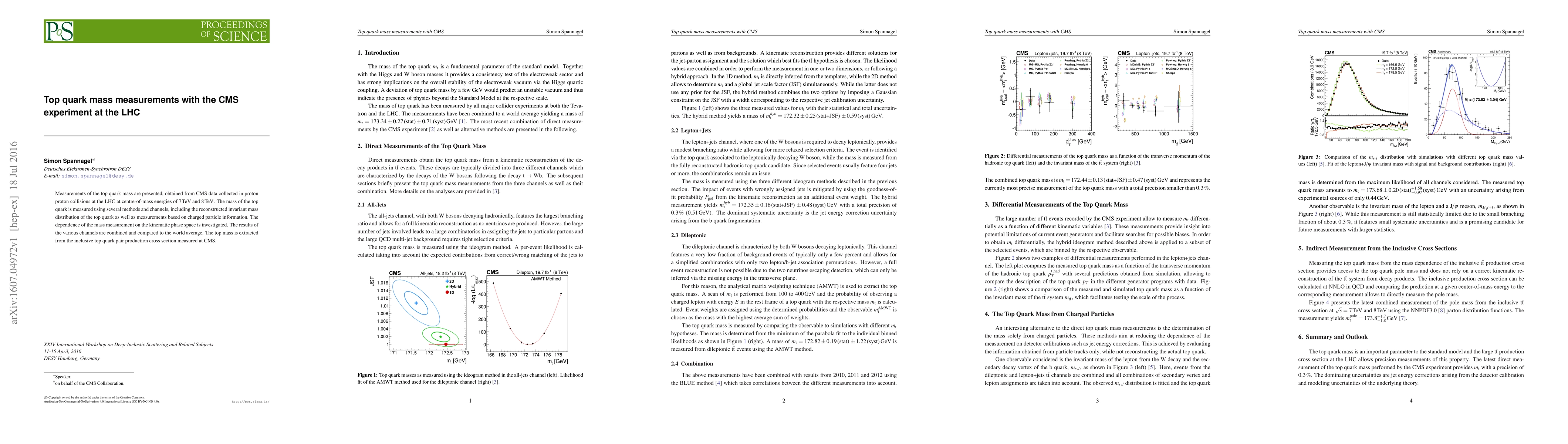 The CMS experiment used several methods to measure top quark mass, including reconstructed invariant mass distribution of the top quark and measurements based on charged particle information.