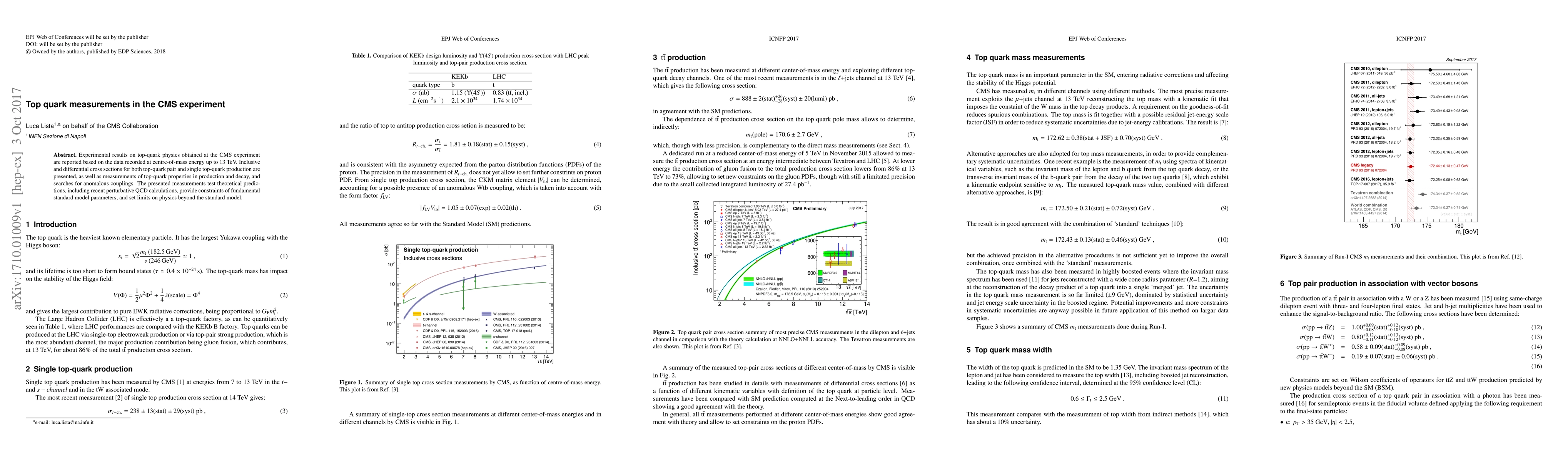 This paper reports experimental results from the CMS experiment on top-quark physics at energies up to 13 TeV, including measurements of inclusive and differential cross sections for top-quark pair and single top-quark production, as well as tests of theoretical predictions and constraints on fundamental standard model parameters.