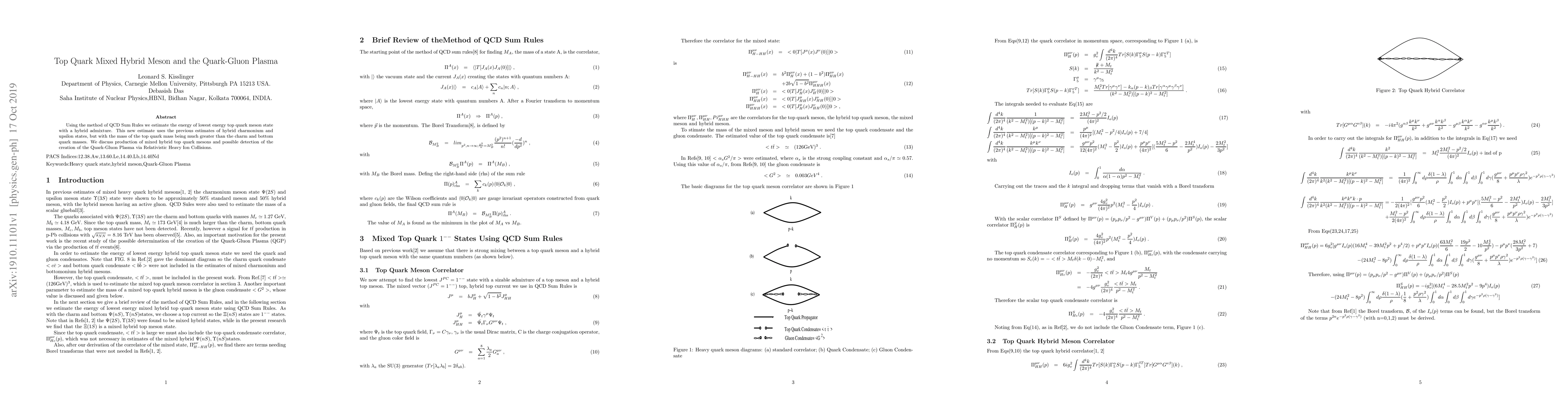 Using the method of QCD Sum Rules we estimate the energy of lowest energy top quark meson state with a hybrid admixture. This new estimate uses the previous estimates of hybrid charmonium and upsilon states, but with the mass of the top quark mass being much greater than the charm and bottom quark masses. We discuss production of mixed hybrid top quark mesons and possible detection of the creation of the Quark-Gluon Plasma via Relativistic Heavy Ion Collisions.