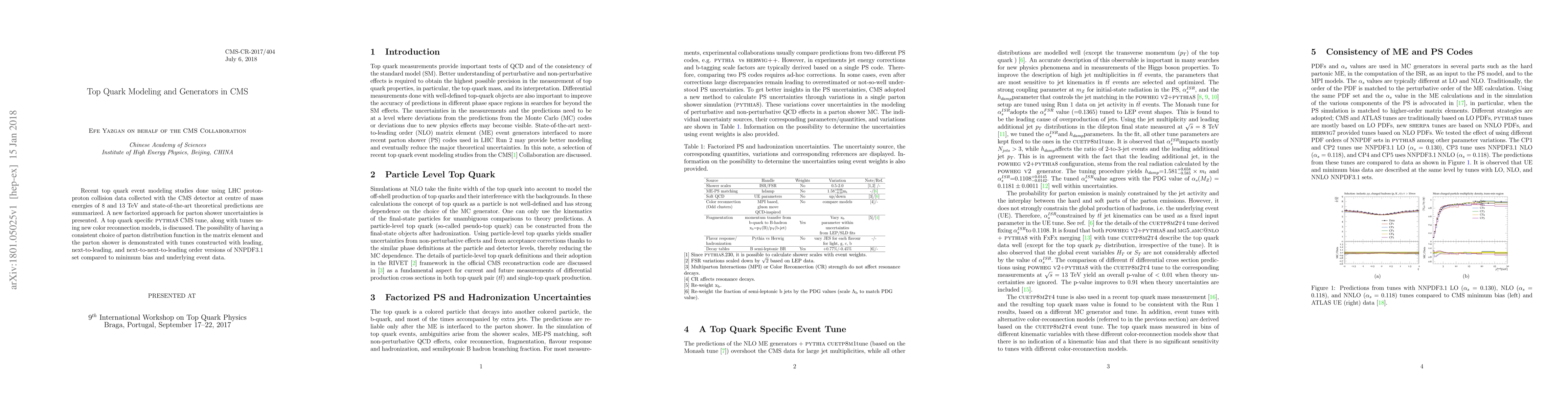 Recent top quark event modeling studies done using LHC proton-proton collision data collected with the CMS detector at centre of mass energies of 8 and 13 TeV and state-of-the-art theoretical predictions are summarized. A new factorized approach for parton shower uncertainties is presented. A top quark specific PYTHIA8 CMS tune, along with tunes using new color reconnection models, is discussed. The possibility of having a consistent choice of parton distribution function in the matrix element and the parton shower is demonstrated with tunes constructed with leading, next-to-leading, and next-to-next-to-leading order versions of NNPDF3.1 set compared to minimum bias and underlying event data.
