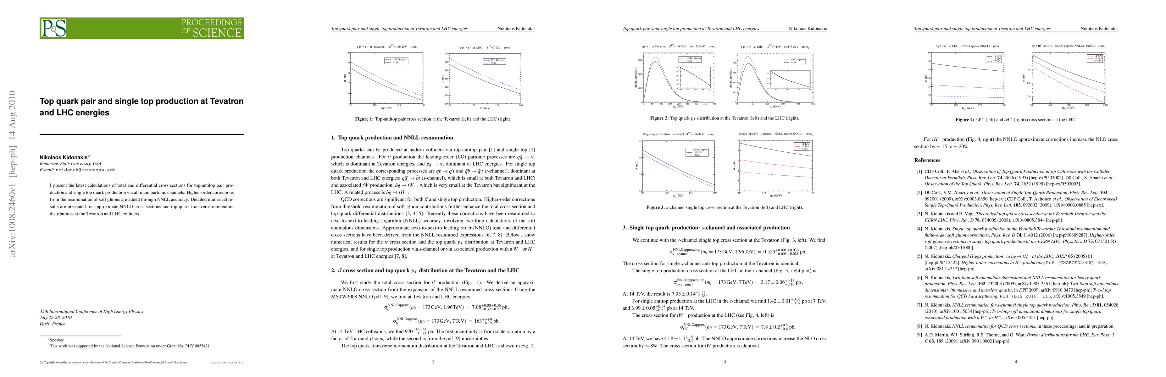 This paper presents refined calculations for top-antitop pair and single top quark production at Tevatron and LHC energies, incorporating higher-order corrections up to NNLL accuracy for improved precision. Detailed numerical results for approximate NNLO cross sections and top quark transverse momentum distributions are provided.