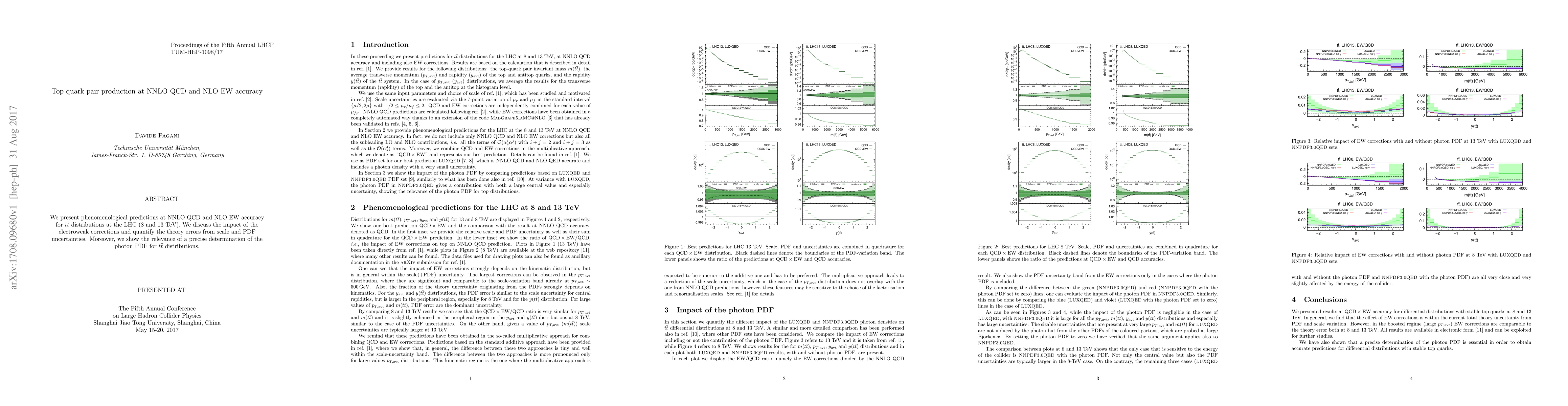 We present phenomenological predictions at NNLO QCD and NLO EW accuracy for $t \bar t$ distributions at the LHC (8 and 13 TeV). We discuss the impact of the electroweak corrections and quantify the theory errors from scale and PDF uncertainties. Moreover, we show the relevance of a precise determination of the photon PDF for $t \bar t$ distributions.