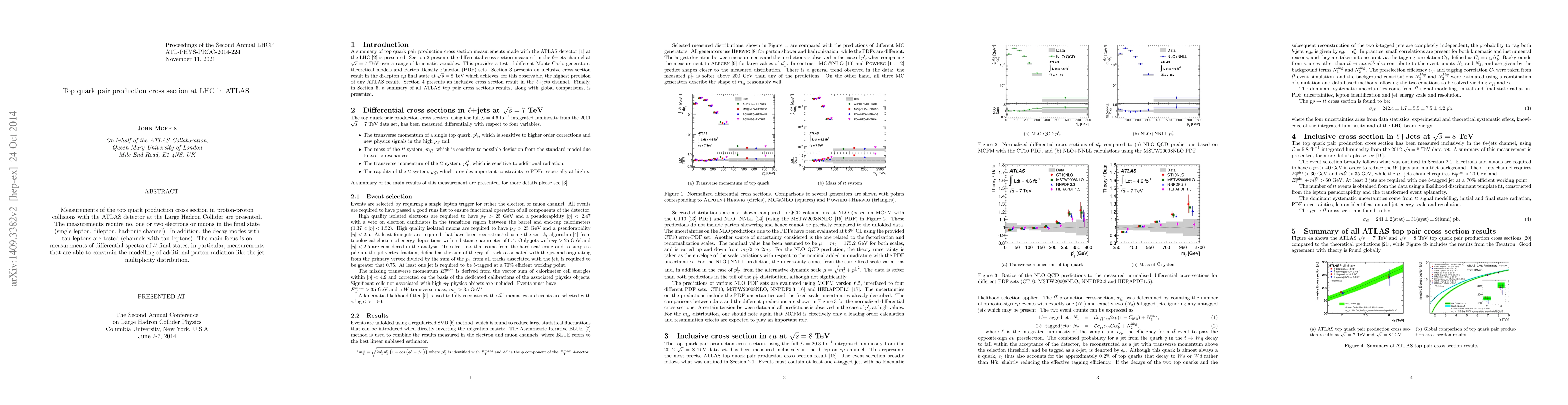 This paper presents measurements of the top quark pair production cross section using the ATLAS detector at the LHC, focusing on various decay channels including single lepton, dilepton, and hadronic final states, with an emphasis on differential spectra to constrain additional parton radiation modeling.