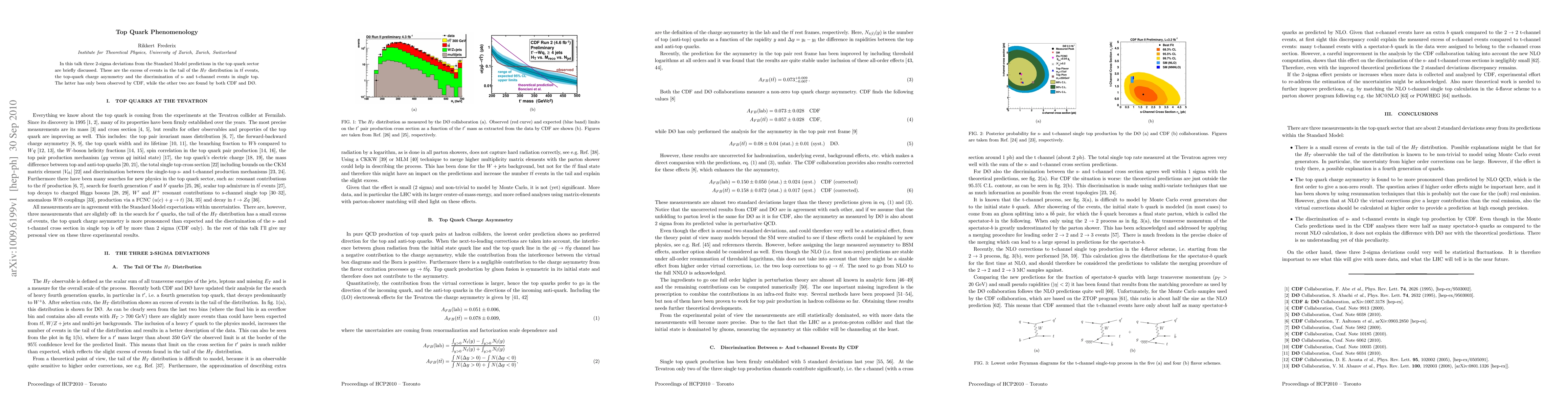 In this talk three 2-sigma deviations from the Standard Model predictions in the top quark sector are briefly discussed. These are the excess of events in the tail of the H_T distribution in ttbar events, the top-quark charge asymmetry and the discrimination of s- and t-channel events in single top. The latter has only been observed by CDF, while the other two are found by both CDF and D0.