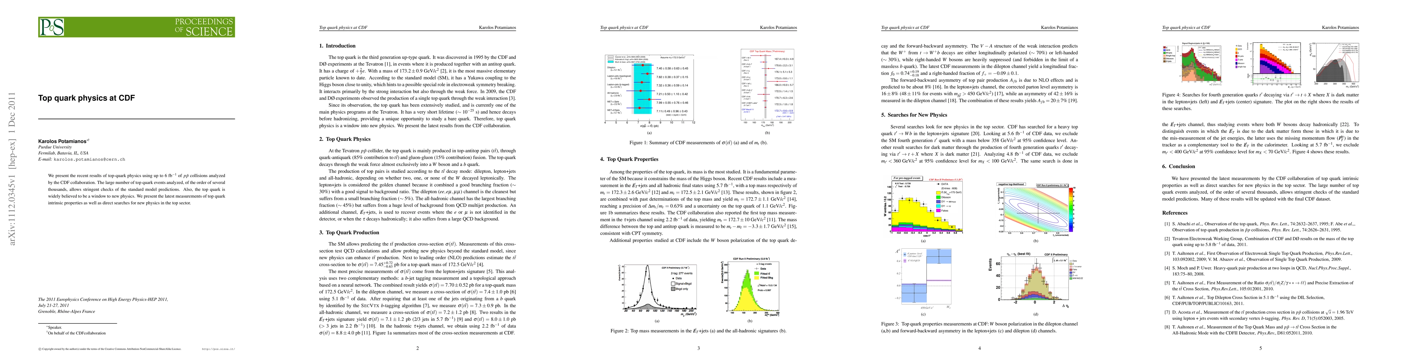 We present the recent results of top-quark physics using up to 6 fb$^{-1}$ of $p\bar{p}$ collisions analyzed by the CDF collaboration. The large number of top quark events analyzed, of the order of several thousands, allows stringent checks of the standard model predictions. Also, the top quark is widely believed to be a window to new physics. We present the latest measurements of top quark intrinsic properties as well as direct searches for new physics in the top sector.