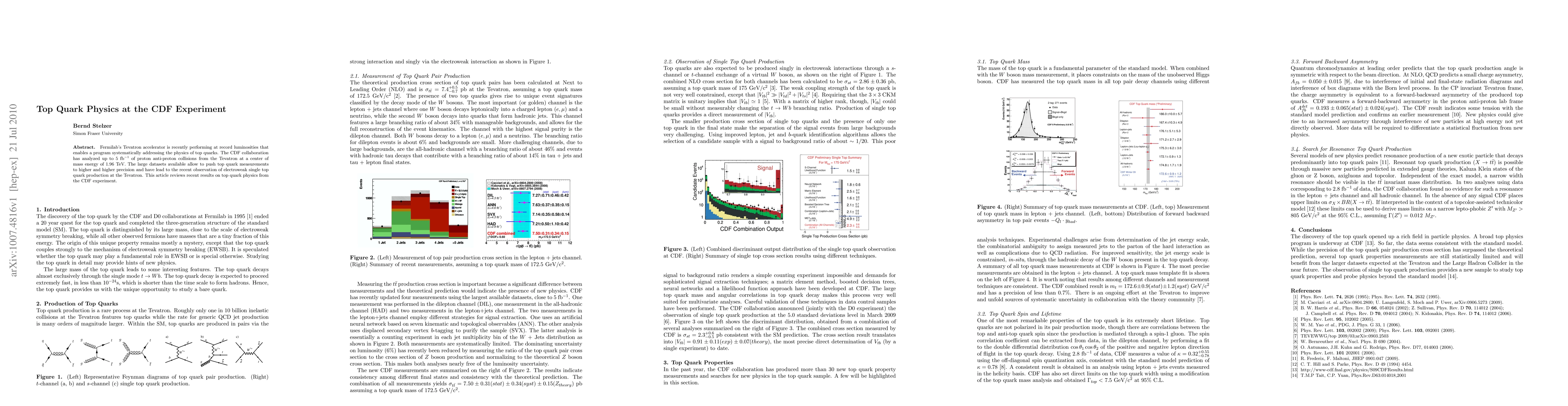 The CDF collaboration at Fermilab's Tevatron has analyzed extensive datasets from proton-antiproton collisions at 1.96 TeV, achieving high-precision measurements of top quark physics and observing electroweak single top quark production. This paper reviews recent advancements in top quark research from the CDF experiment.