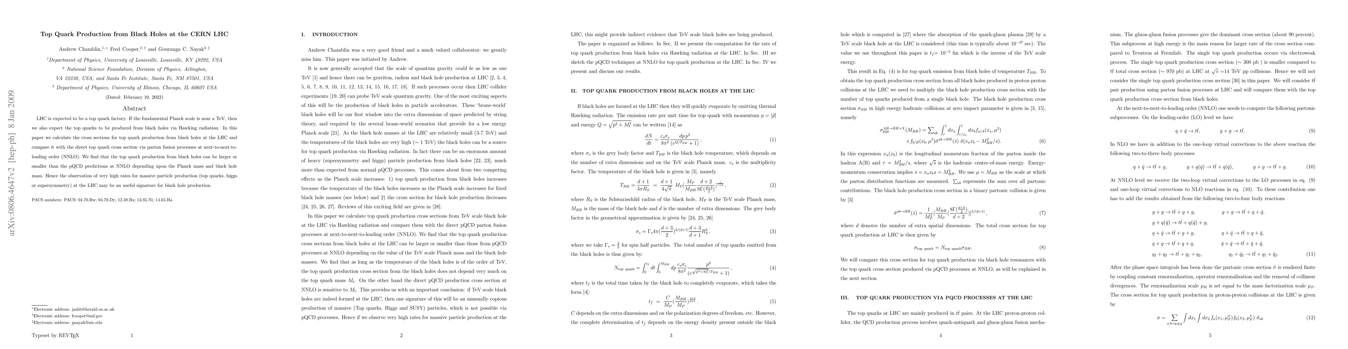 This paper calculates the cross-section for top quark production from black holes via Hawking radiation at the CERN LHC, comparing it to standard parton fusion processes. It finds that the production from black holes can vary significantly based on the Planck and black hole masses, suggesting high rates of massive particle production could indicate black hole activity.