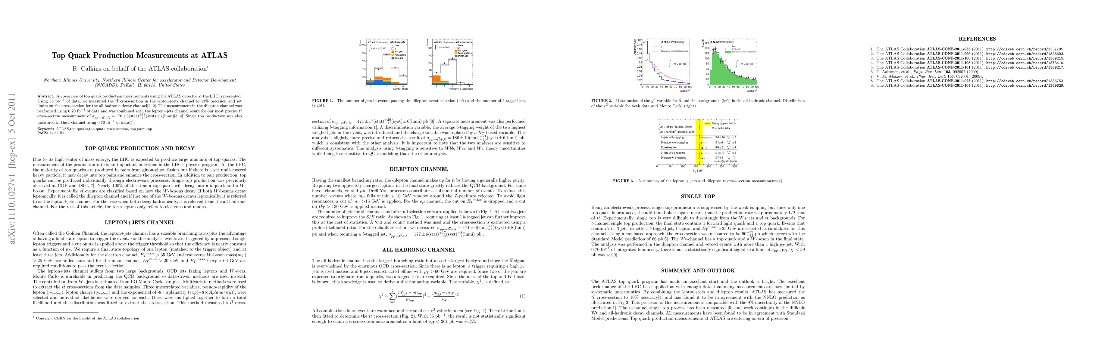 The ATLAS detector measured top quark production with high precision, setting limits on cross-sections for different decay channels, while also determining single top production in the t-channel.
