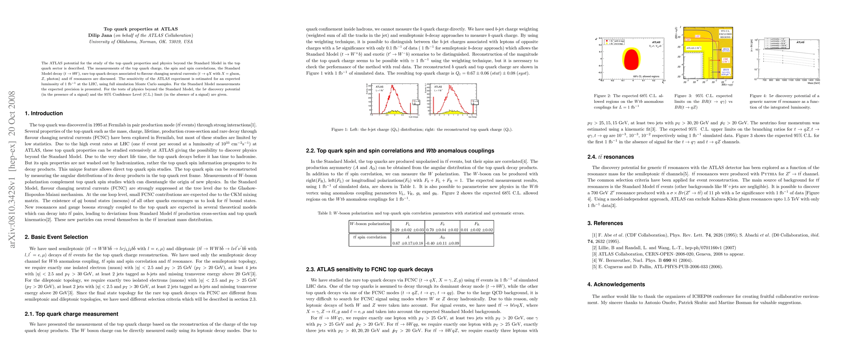 This paper explores the ATLAS experiment's capabilities for studying top quark properties and potential physics beyond the Standard Model, detailing measurements of top quark charge, spin correlations, and rare decays, and estimating the experiment's sensitivity for an expected luminosity of 1fb^-1 at the LHC. Expected precision for Standard Model measurements and discovery potential for new physics are also discussed.