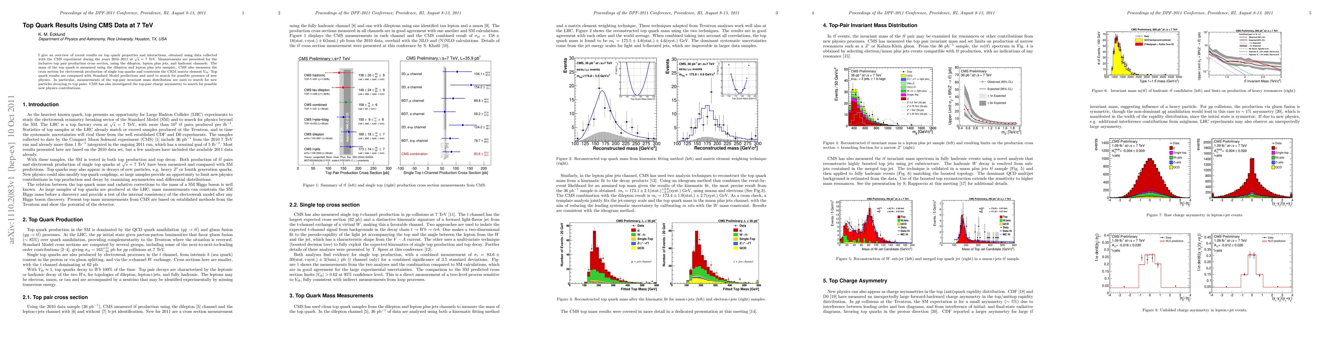 I give an overview of recent results on top quark properties and interactions, obtained using data collected with the CMS experiment during the years 2010--2011 at sqrt(s)= 7 TeV. Measurements are presented for the inclusive top pair production cross section, using the dilepton, lepton plus jets, and hadronic channels. The mass of the top quark is measured using the dilepton and lepton plus jets samples. CMS also measures the cross section for electroweak production of single top quarks and constrains the CKM matrix element V_tb. Top quark results are compared with Standard Model predictions and used to search for possible presence of new physics. In particular, measurements of the top-pair invariant mass distribution are used to search for new particles decaying to top pairs. CMS has also investigated the top-pair charge asymmetry to search for possible new physics contributions.