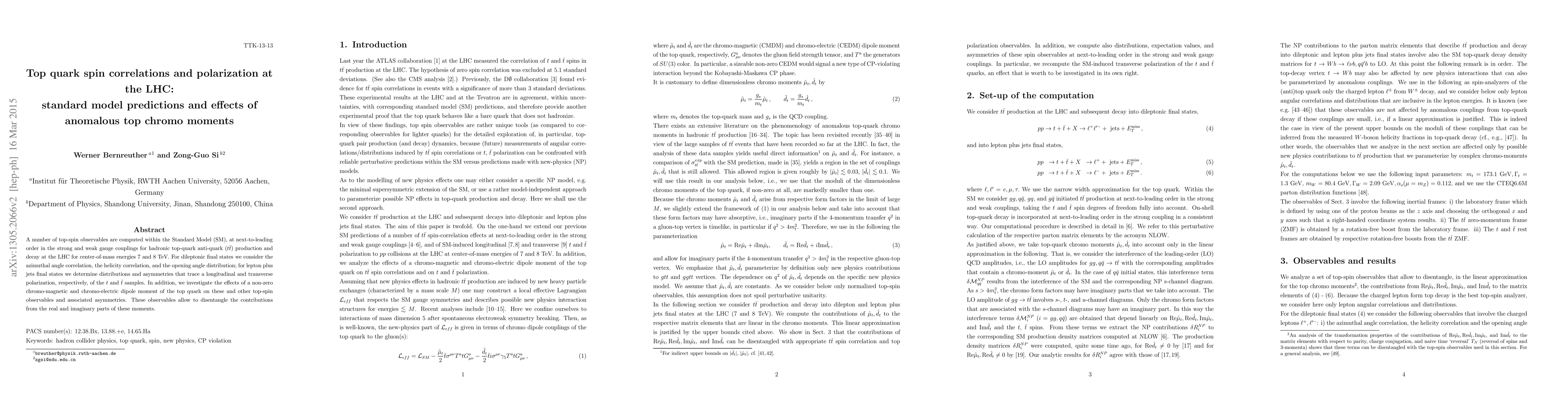 This paper computes various top-spin observables in the Standard Model at the LHC, including correlations and polarization effects, and examines how anomalous top chromo moments influence these measurements. It investigates both dileptonic and lepton plus jets final states to assess the top quark's spin properties and the impact of non-zero chromo-magnetic and chromo-electric dipole moments.