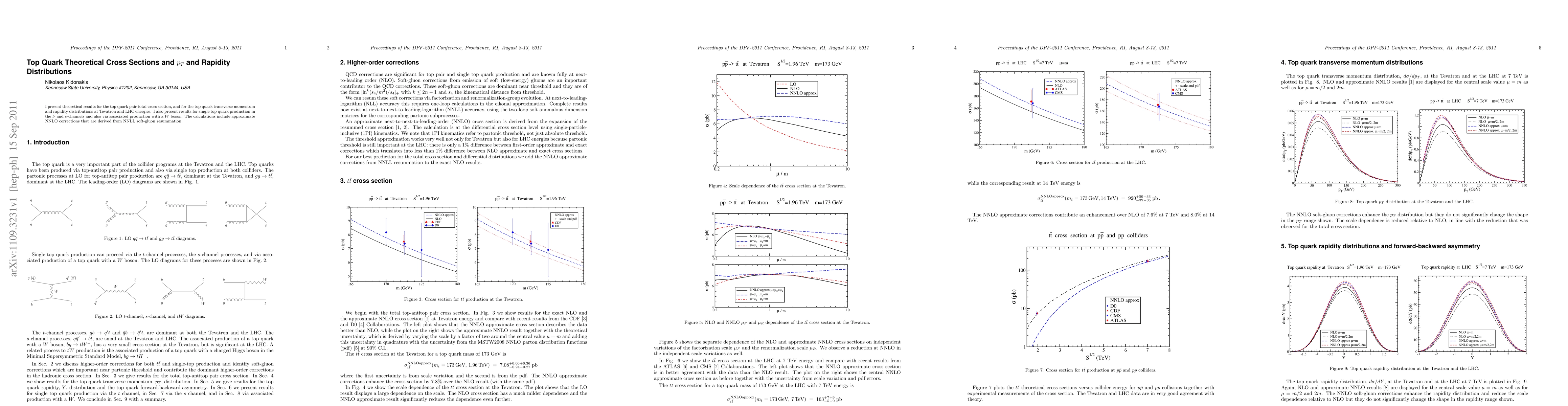 This paper provides theoretical results for top quark pair total cross sections and distributions in transverse momentum and rapidity at Tevatron and LHC energies, including single top quark production via t- and s-channels and W-associated production, with calculations incorporating approximate NNLO corrections from NNLL soft-gluon resummation.