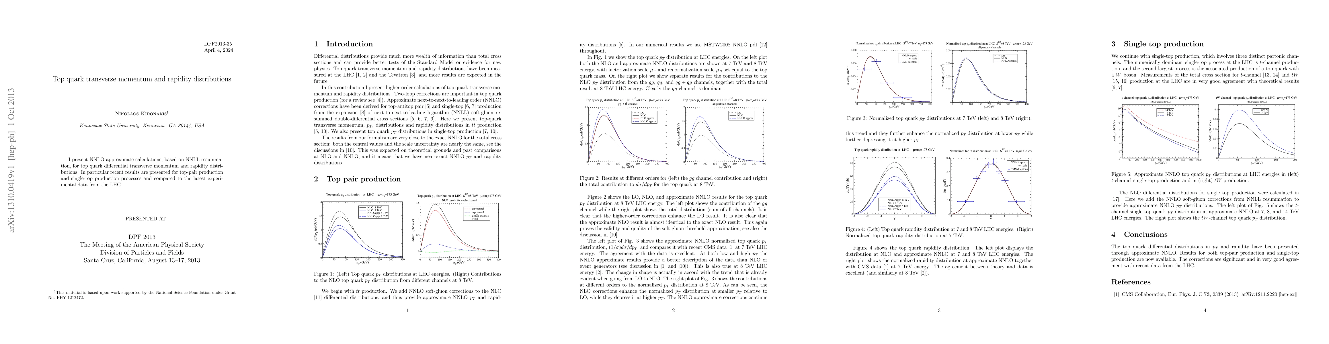 This paper provides NNLO approximate calculations for top quark transverse momentum and rapidity distributions using NNLL resummation, focusing on recent results for top-pair and single-top production processes, and compares these theoretical results with the latest LHC experimental data.