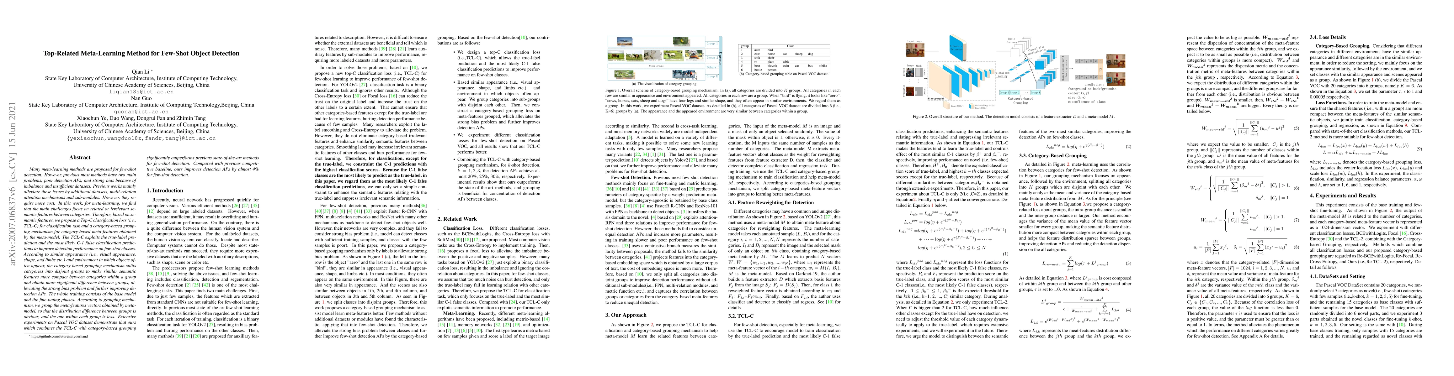 This paper proposes a Top-Related Meta-Learning method for few-shot object detection that addresses poor detection performance and strong bias in previous methods. It introduces a Top-C classification loss (TCL-C) and a category-based grouping mechanism to enhance detection performance and reduce bias, achieving nearly a 4% improvement in detection APs on the Pascal VOC dataset.