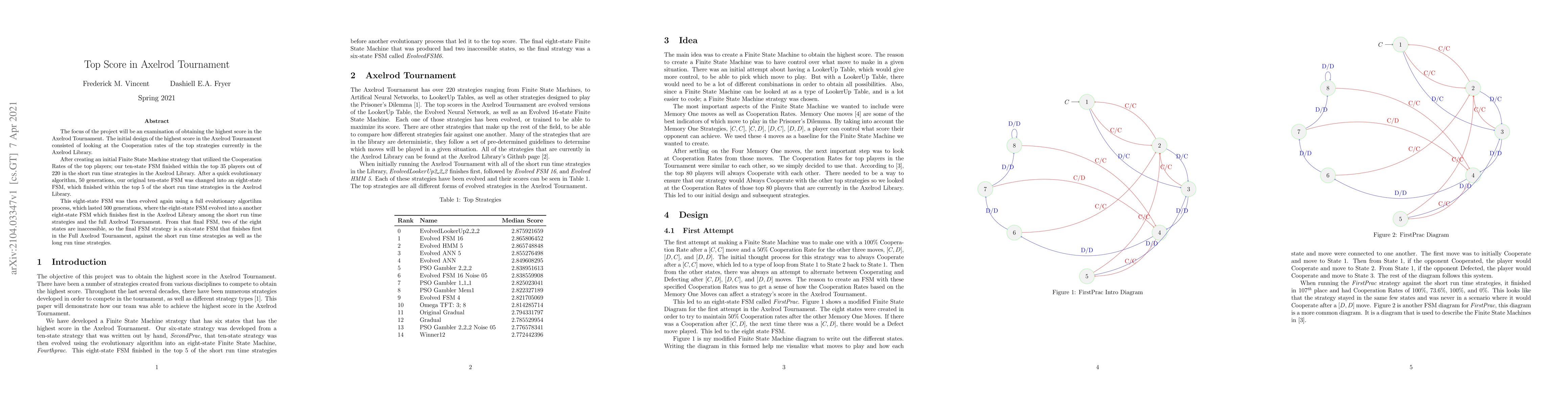 The focus of the project will be an examination of obtaining the highest score in the Axelrod Tournament. The initial design of the highest score in the Axelrod Tournament consisted of looking at the Cooperation rates of the top strategies currently in the Axelrod Library. After creating an initial Finite State Machine strategy that utilized the Cooperation Rates of the top players; our ten-state FSM finished within the top 35 players out of 220 in the short run time strategies in the Axelrod Library. After a quick evolutionary algorithm, 50 generations, our original ten-state FSM was changed into an eight-state FSM, which finished within the top 5 of the short run time strategies in the Axelrod Library. This eight-state FSM was then evolved again using a full evolutionary algortihm process, which lasted 500 generations, where the eight-state FSM evolved into a another eight-state FSM which finishes first in the Axelrod Library among the short run time strategies and the full Axelrod Tournament. From that final FSM, two of the eight states are inaccessible, so the final FSM strategy is a six-state FSM that finishes first in the Full Axelrod Tournament, against the short run time strategies as well as the long run time strategies.