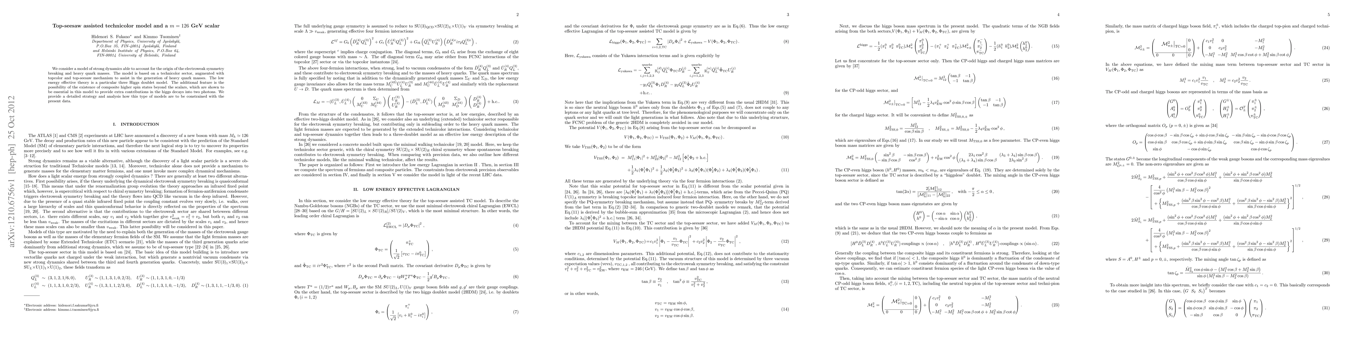 This paper explores a top-seesaw assisted technicolor model that explains electroweak symmetry breaking and heavy quark masses through strong dynamics and a three Higgs doublet framework. It also considers the possibility of composite higher spin states contributing to Higgs decays into two photons, and outlines strategies for constraining such models with current data.