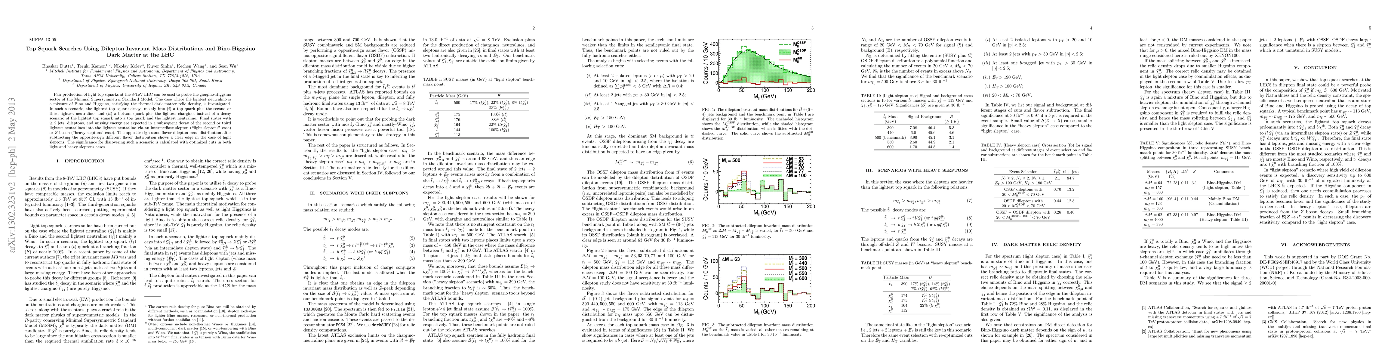Pair production of light top squarks at the 8-TeV LHC can be used to probe the gaugino-Higgsino sector of the Minimal Supersymmetric Standard Model. The case where the lightest neutralino is a mixture of Bino and Higgsino, satisfying the thermal dark matter relic density, is investigated. In such a scenario, the lightest top squark decays mostly into $(i)$ a top quark plus the second or third lightest neutralino, and $(ii)$ a bottom quark plus the lightest chargino, instead of a decay scenario of the lightest top squark into a top quark and the lightest neutralino. Final states with $\geq 2$ jets, dileptons, and missing energy are expected in a subsequent decay of the second or third lightest neutralinos into the lightest neutralino via an intermediate slepton ("light sleptons" case) or $Z$ boson ("heavy sleptons" case). The opposite-sign same flavor dilepton mass distribution after subtracting the opposite-sign different flavor distribution shows a clear edge in the case of light sleptons. The significance for discovering such a scenario is calculated with optimized cuts in both light and heavy sleptons cases.