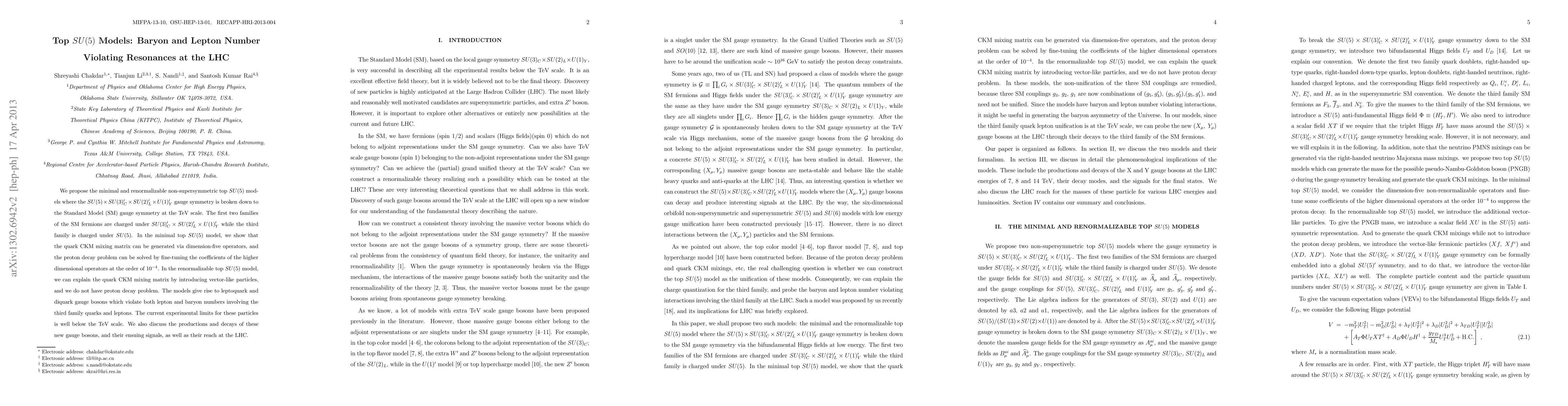 This paper proposes two new top SU(5) models that solve the proton decay problem through fine-tuning or introducing vector-like particles, and predict new gauge bosons that violate lepton and baryon numbers.