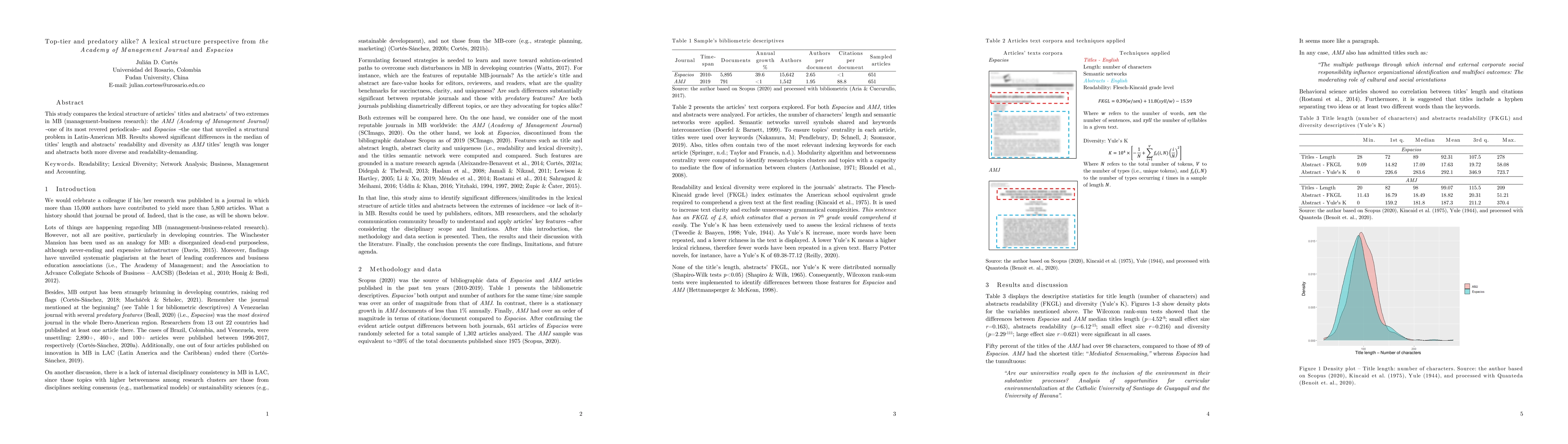 This study contrasts the lexical structures of titles and abstracts from the prestigious Academy of Management Journal and the controversial Espacios, revealing that AMJ titles are longer while Espacios abstracts exhibit greater diversity and higher readability demands.
