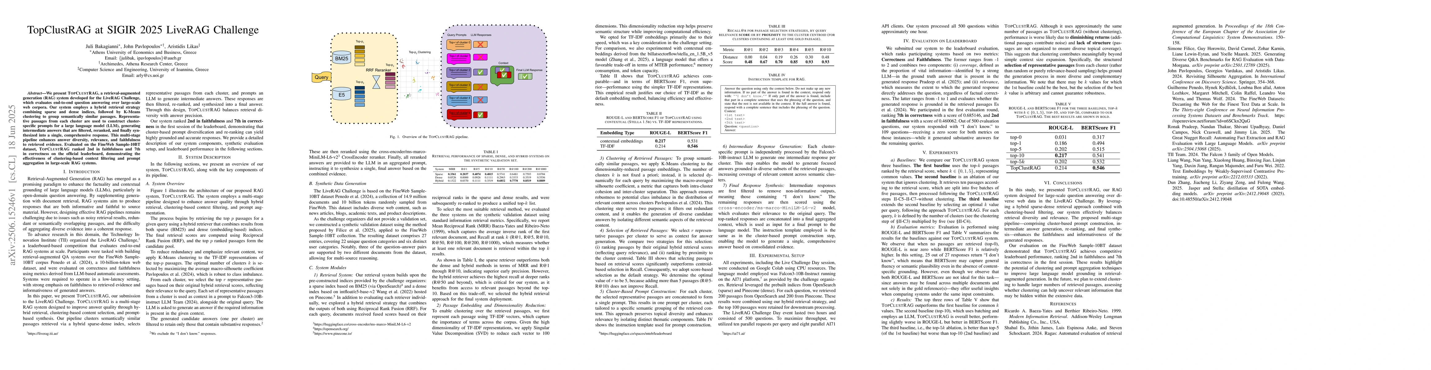 TopClustRAG is a retrieval-augmented generation system for question answering, combining sparse and dense indices with K-Means clustering. It outperformed in faithfulness (2nd place) and correctly answered questions (7th place) in the LiveRAG Challenge using the FineWeb Sample-10BT dataset, showcasing the benefits of clustering and prompt aggregation in large-scale RAG systems.
