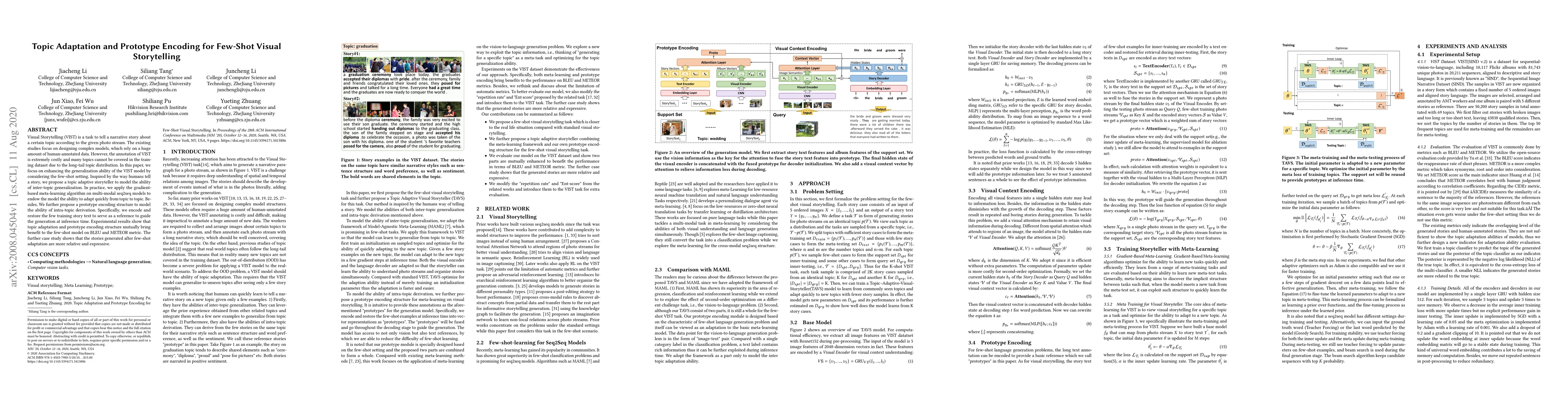 This paper proposes a few-shot visual storytelling model that enhances generalization through topic adaptation and prototype encoding. It utilizes gradient-based meta-learning and a multi-modal seq2seq framework, showing improved performance on BLEU and METEOR metrics and generating more relevant and expressive stories.