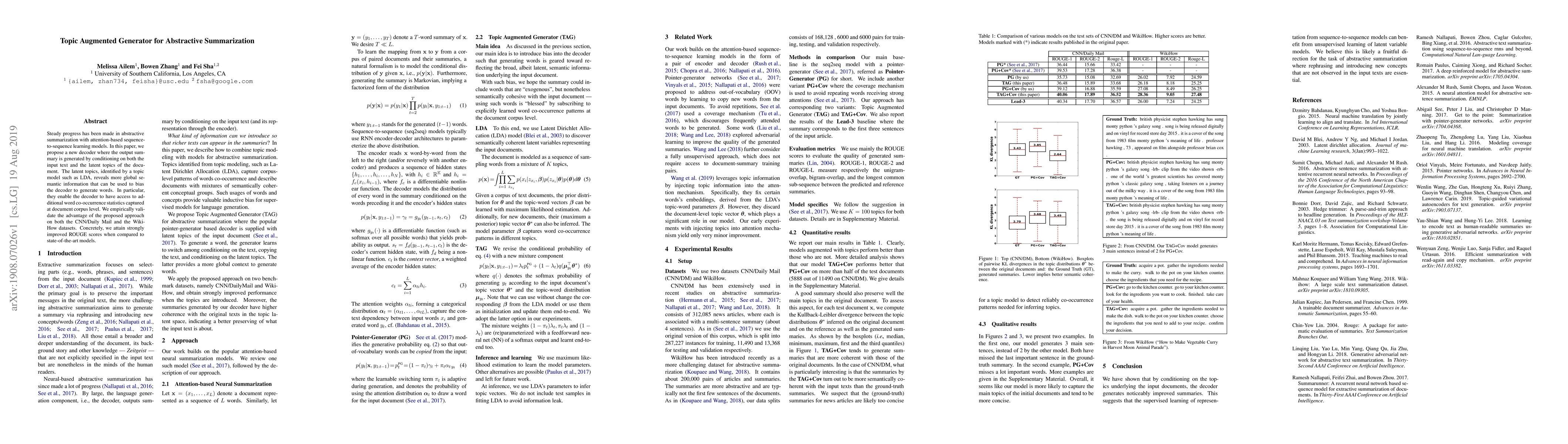 This paper proposes a novel decoder for abstractive summarization that incorporates latent topics identified by a topic model, improving summarization by leveraging global semantic information and word co-occurrence statistics. The method achieves significantly higher ROUGE scores compared to existing models on CNN/Daily Mail and WikiHow datasets.