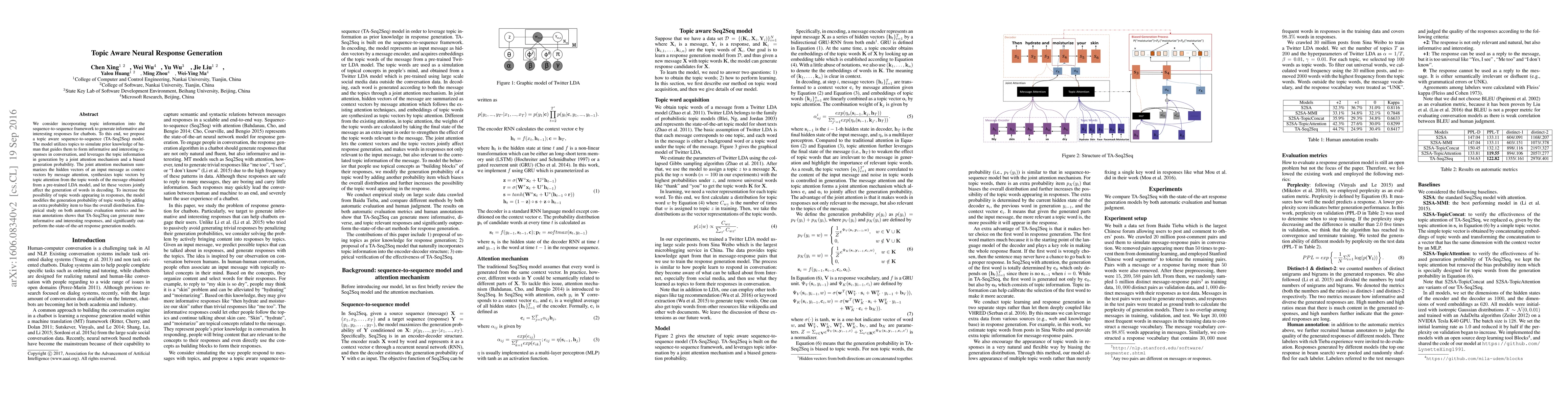 This paper proposes a topic aware sequence-to-sequence (TA-Seq2Seq) model to generate informative and interesting chatbot responses by incorporating topic information. The model uses a joint attention mechanism and biased generation probability to enhance response relevance and interest, outperforming existing models in both automatic metrics and human evaluations.