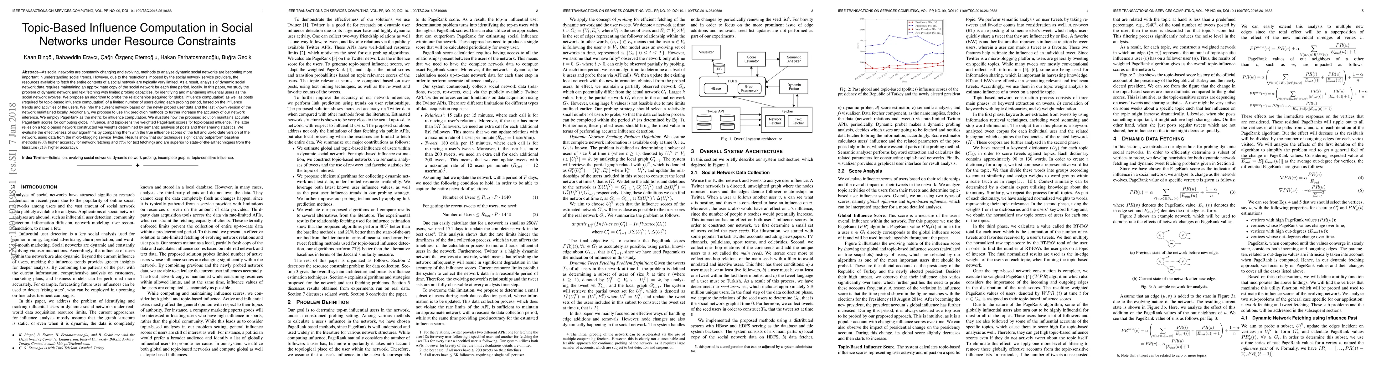 As social networks are constantly changing and evolving, methods to analyze dynamic social networks are becoming more important in understanding social trends. However, due to the restrictions imposed by the social network service providers, the resources available to fetch the entire contents of a social network are typically very limited. As a result, analysis of dynamic social network data requires maintaining an approximate copy of the social network for each time period, locally. In this paper, we study the problem of dynamic network and text fetching with limited probing capacities, for identifying and maintaining influential users as the social network evolves. We propose an algorithm to probe the relationships (required for global influence computation) as well as posts (required for topic-based influence computation) of a limited number of users during each probing period, based on the influence trends and activities of the users. We infer the current network based on the newly probed user data and the last known version of the network maintained locally. Additionally, we propose to use link prediction methods to further increase the accuracy of our network inference. We employ PageRank as the metric for influence computation. We illustrate how the proposed solution maintains accurate PageRank scores for computing global influence, and topic-sensitive weighted PageRank scores for topic-based influence. The latter relies on a topic-based network constructed via weights determined by semantic analysis of posts and their sharing statistics. We evaluate the effectiveness of our algorithms by comparing them with the true influence scores of the full and up-to-date version of the network, using data from the micro-blogging service Twitter. Results show that our techniques significantly outperform baseline methods and are superior to state-of-the-art techniques from the literature.