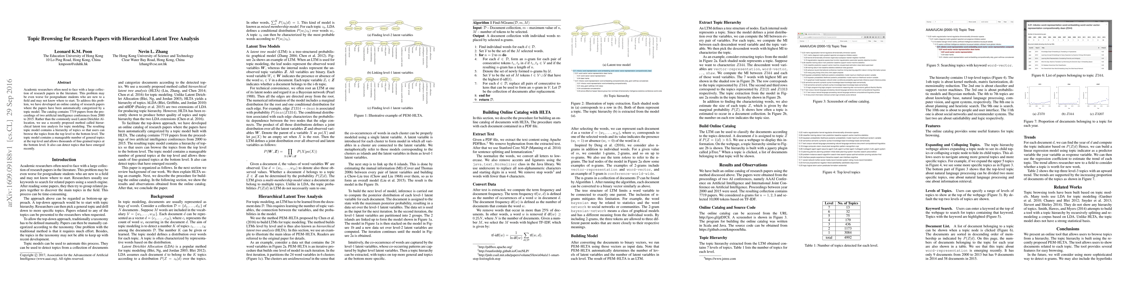 Academic researchers often need to face with a large collection of research papers in the literature. This problem may be even worse for postgraduate students who are new to a field and may not know where to start. To address this problem, we have developed an online catalog of research papers where the papers have been automatically categorized by a topic model. The catalog contains 7719 papers from the proceedings of two artificial intelligence conferences from 2000 to 2015. Rather than the commonly used Latent Dirichlet Allocation, we use a recently proposed method called hierarchical latent tree analysis for topic modeling. The resulting topic model contains a hierarchy of topics so that users can browse the topics from the top level to the bottom level. The topic model contains a manageable number of general topics at the top level and allows thousands of fine-grained topics at the bottom level. It also can detect topics that have emerged recently.