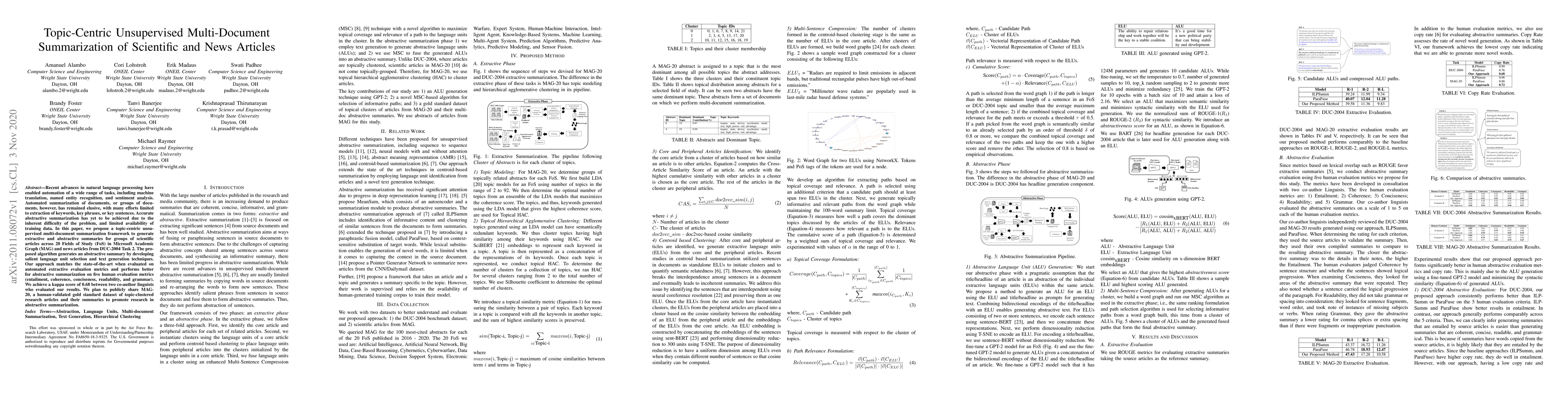 Recent advances in natural language processing have enabled automation of a wide range of tasks, including machine translation, named entity recognition, and sentiment analysis. Automated summarization of documents, or groups of documents, however, has remained elusive, with many efforts limited to extraction of keywords, key phrases, or key sentences. Accurate abstractive summarization has yet to be achieved due to the inherent difficulty of the problem, and limited availability of training data. In this paper, we propose a topic-centric unsupervised multi-document summarization framework to generate extractive and abstractive summaries for groups of scientific articles across 20 Fields of Study (FoS) in Microsoft Academic Graph (MAG) and news articles from DUC-2004 Task 2. The proposed algorithm generates an abstractive summary by developing salient language unit selection and text generation techniques. Our approach matches the state-of-the-art when evaluated on automated extractive evaluation metrics and performs better for abstractive summarization on five human evaluation metrics (entailment, coherence, conciseness, readability, and grammar). We achieve a kappa score of 0.68 between two co-author linguists who evaluated our results. We plan to publicly share MAG-20, a human-validated gold standard dataset of topic-clustered research articles and their summaries to promote research in abstractive summarization.