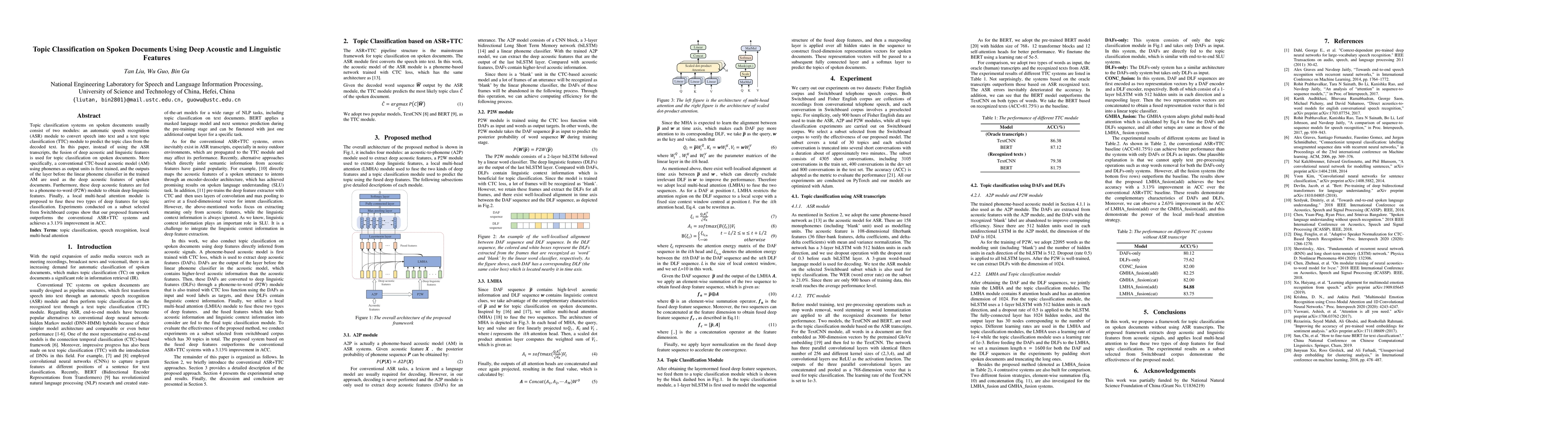 Topic classification systems on spoken documents usually consist of two modules: an automatic speech recognition (ASR) module to convert speech into text and a text topic classification (TTC) module to predict the topic class from the decoded text. In this paper, instead of using the ASR transcripts, the fusion of deep acoustic and linguistic features is used for topic classification on spoken documents. More specifically, a conventional CTC-based acoustic model (AM) using phonemes as output units is first trained, and the outputs of the layer before the linear phoneme classifier in the trained AM are used as the deep acoustic features of spoken documents. Furthermore, these deep acoustic features are fed to a phoneme-to-word (P2W) module to obtain deep linguistic features. Finally, a local multi-head attention module is proposed to fuse these two types of deep features for topic classification. Experiments conducted on a subset selected from Switchboard corpus show that our proposed framework outperforms the conventional ASR+TTC systems and achieves a 3.13% improvement in ACC.