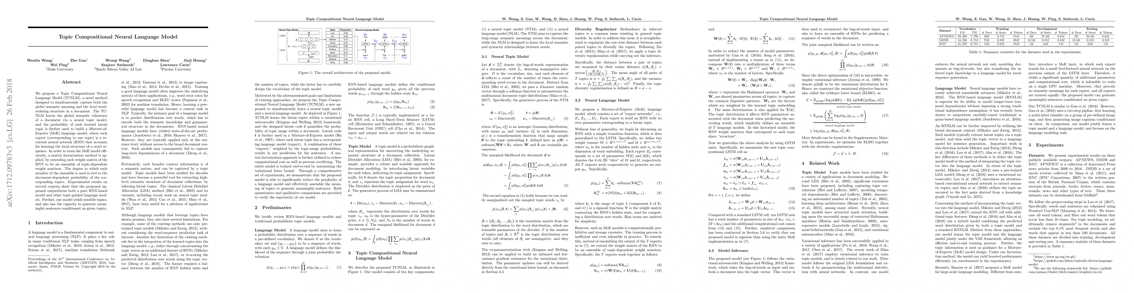 The paper introduces a Topic Compositional Neural Language Model (TCNLM) that combines global semantic coherence and local word ordering through a neural topic model and a Mixture-of-Experts language model. The model outperforms traditional RNN-based models and generates meaningful sentences conditioned on learned topics.