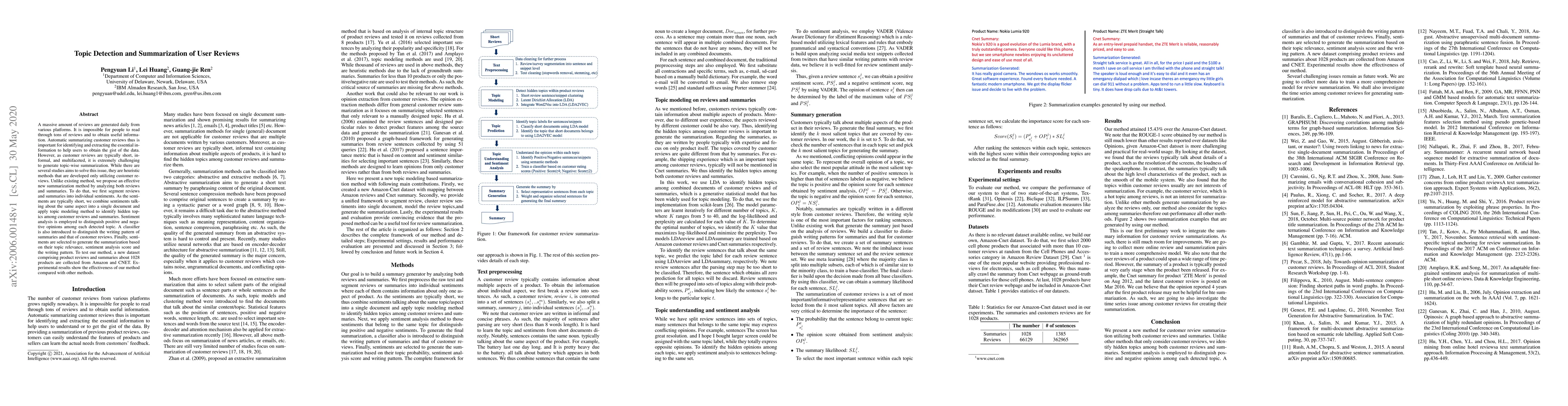 A massive amount of reviews are generated daily from various platforms. It is impossible for people to read through tons of reviews and to obtain useful information. Automatic summarizing customer reviews thus is important for identifying and extracting the essential information to help users to obtain the gist of the data. However, as customer reviews are typically short, informal, and multifaceted, it is extremely challenging to generate topic-wise summarization.While there are several studies aims to solve this issue, they are heuristic methods that are developed only utilizing customer reviews. Unlike existing method, we propose an effective new summarization method by analyzing both reviews and summaries.To do that, we first segment reviews and summaries into individual sentiments. As the sentiments are typically short, we combine sentiments talking about the same aspect into a single document and apply topic modeling method to identify hidden topics among customer reviews and summaries. Sentiment analysis is employed to distinguish positive and negative opinions among each detected topic. A classifier is also introduced to distinguish the writing pattern of summaries and that of customer reviews. Finally, sentiments are selected to generate the summarization based on their topic relevance, sentiment analysis score and the writing pattern. To test our method, a new dataset comprising product reviews and summaries about 1028 products are collected from Amazon and CNET. Experimental results show the effectiveness of our method compared with other methods.