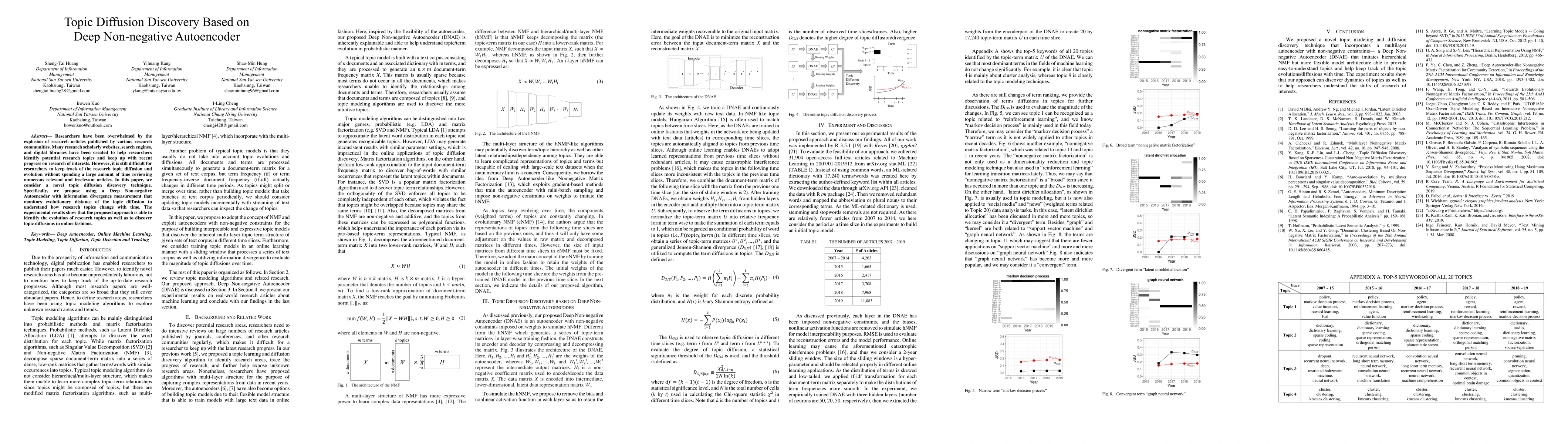 Researchers have been overwhelmed by the explosion of research articles published by various research communities. Many research scholarly websites, search engines, and digital libraries have been created to help researchers identify potential research topics and keep up with recent progress on research of interests. However, it is still difficult for researchers to keep track of the research topic diffusion and evolution without spending a large amount of time reviewing numerous relevant and irrelevant articles. In this paper, we consider a novel topic diffusion discovery technique. Specifically, we propose using a Deep Non-negative Autoencoder with information divergence measurement that monitors evolutionary distance of the topic diffusion to understand how research topics change with time. The experimental results show that the proposed approach is able to identify the evolution of research topics as well as to discover topic diffusions in online fashions.
