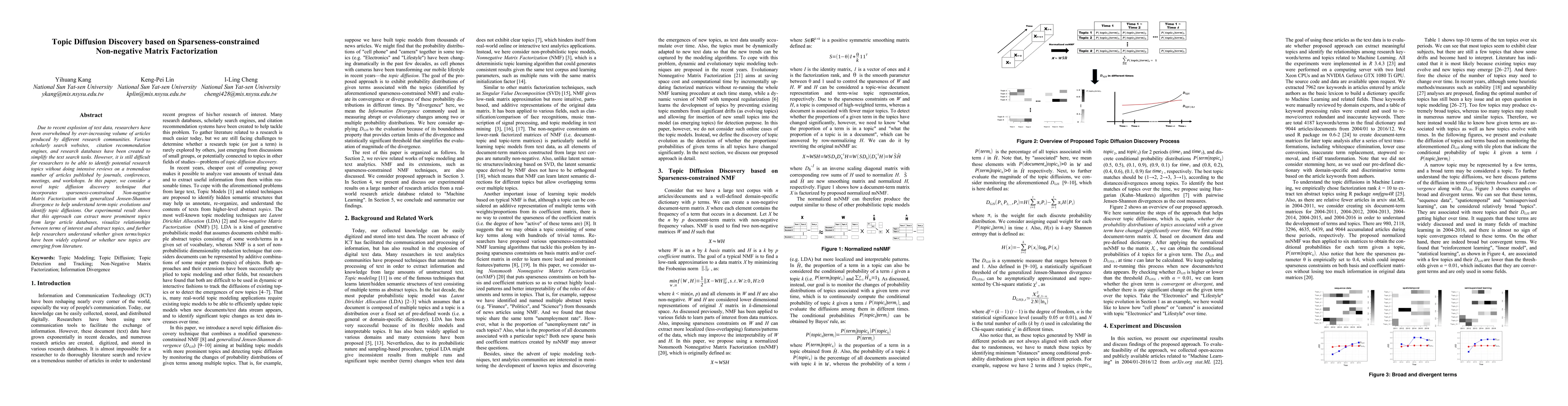 This paper proposes a novel topic diffusion discovery technique using sparseness-constrained Non-negative Matrix Factorization and generalized Jensen-Shannon divergence to identify and visualize term-topic evolutions in large text datasets. Experimental results show improved extraction of prominent topics and insights into term/topic exploration trends.