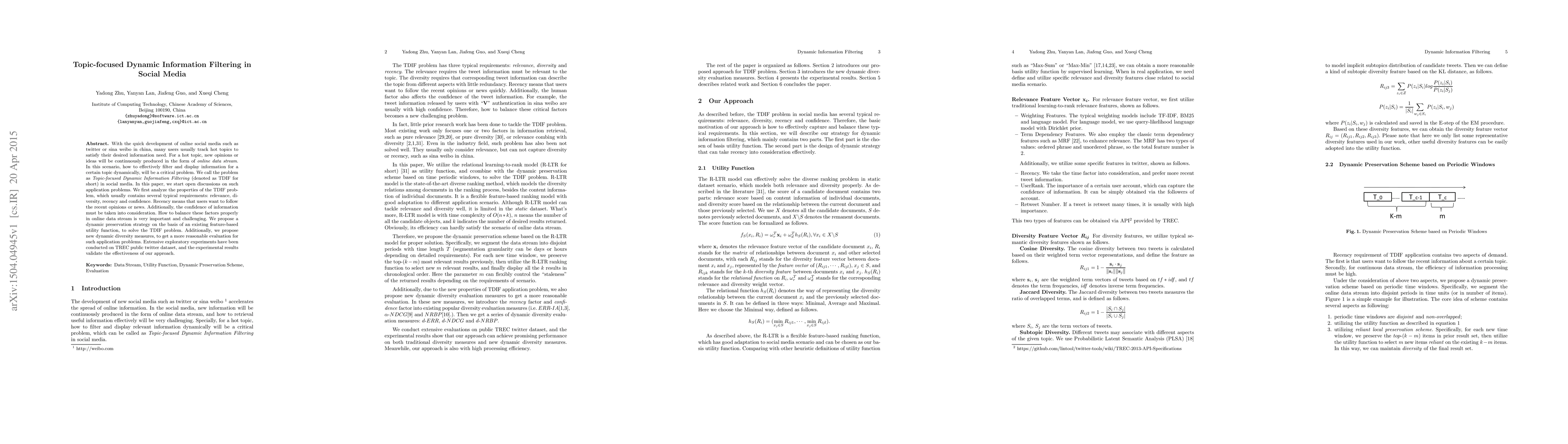 This paper discusses the Topic-focused Dynamic Information Filtering (TDIF) in social media, focusing on balancing relevance, diversity, recency, and confidence in filtering information streams. The authors propose a dynamic preservation strategy and new diversity measures, validated through experiments on a public Twitter dataset.
