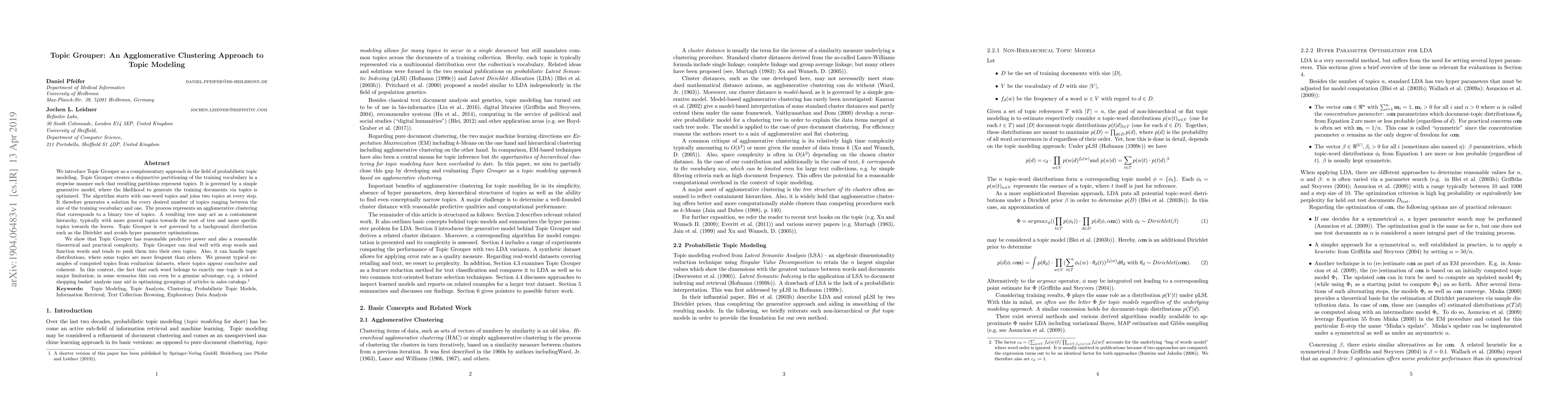 Topic Grouper is an agglomerative clustering method for topic modeling that partitions vocabulary into hierarchical topics, starting from single-word topics and merging them stepwise. It avoids hyperparameter optimization and background distributions, demonstrating reasonable predictive power and coherence in generated topics.