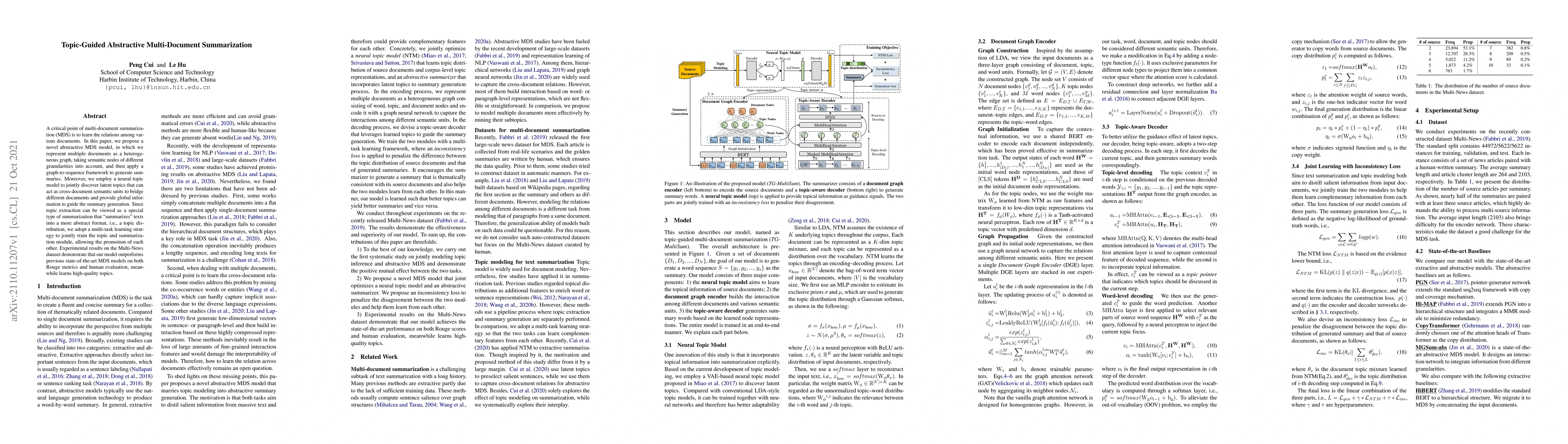 This paper introduces an innovative abstractive multi-document summarization model that represents documents as a heterogeneous graph and employs a graph-to-sequence framework for summarization. It uses a neural topic model to identify latent topics that bridge documents and guide summary generation, enhancing both summarization and topic extraction through multi-task learning.