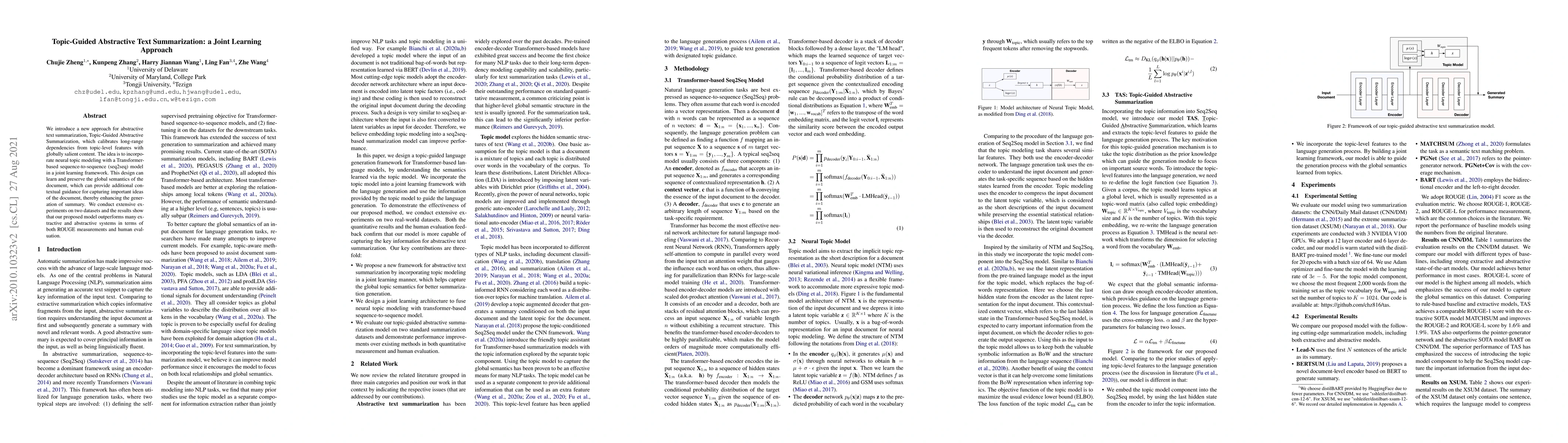 This paper proposes Topic-Guided Abstractive Summarization, a joint learning approach combining neural topic modeling with a Transformer-based seq2seq model to enhance summarization by preserving global semantics and improving idea capture. Experimental results demonstrate superior performance over other methods in both automatic metrics and human evaluation.
