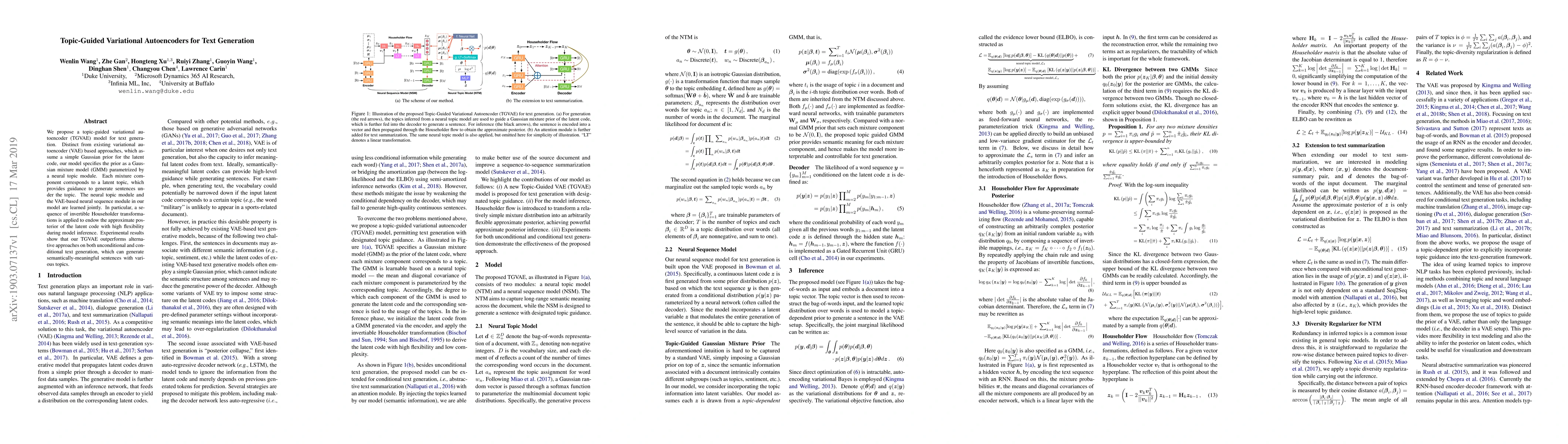 The paper proposes a topic-guided variational autoencoder (TGVAE) for text generation, utilizing a Gaussian mixture model (GMM) for the latent code instead of a simple Gaussian prior. This model incorporates a neural topic module to guide sentence generation under specific topics, demonstrating superior performance in both unconditional and conditional text generation tasks.