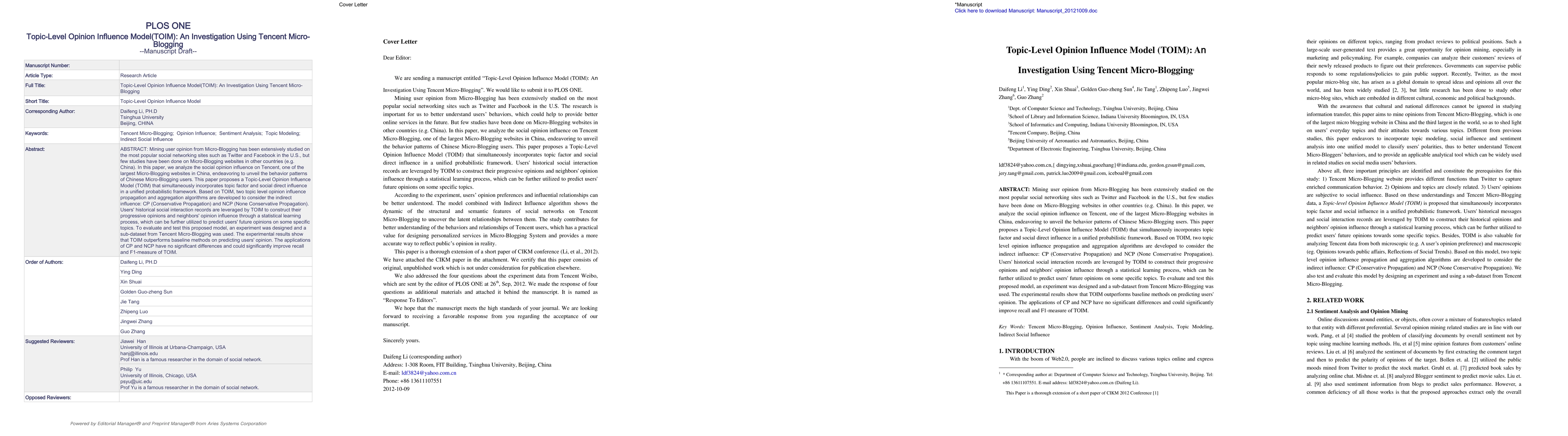 This paper proposes a Topic-Level Opinion Influence Model (TOIM) to analyze opinion influence on Tencent Micro-Blogging, a major platform in China. TOIM integrates topic factors and social influence, and it introduces CP and NCP algorithms for opinion propagation and aggregation, showing improved prediction accuracy over baseline methods.