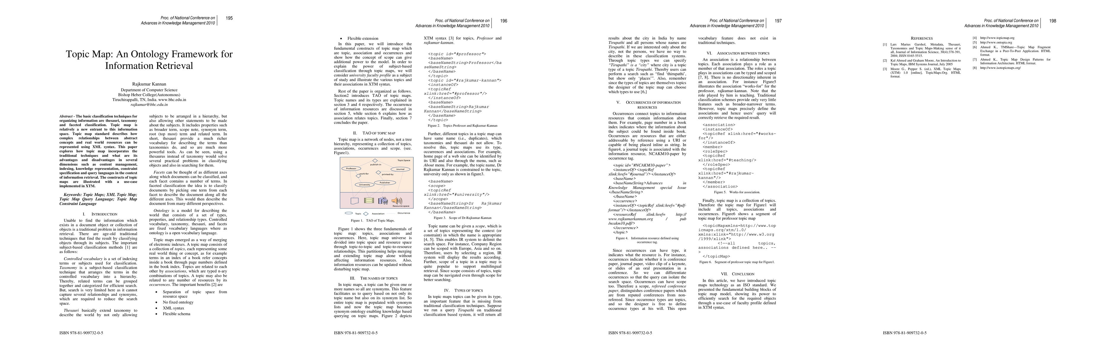 This paper examines the topic map ontology framework for information retrieval, comparing it to traditional classification techniques like thesauri and taxonomy. It highlights its advantages and disadvantages in content management, indexing, and knowledge representation, concluding with a practical implementation using XTM.
