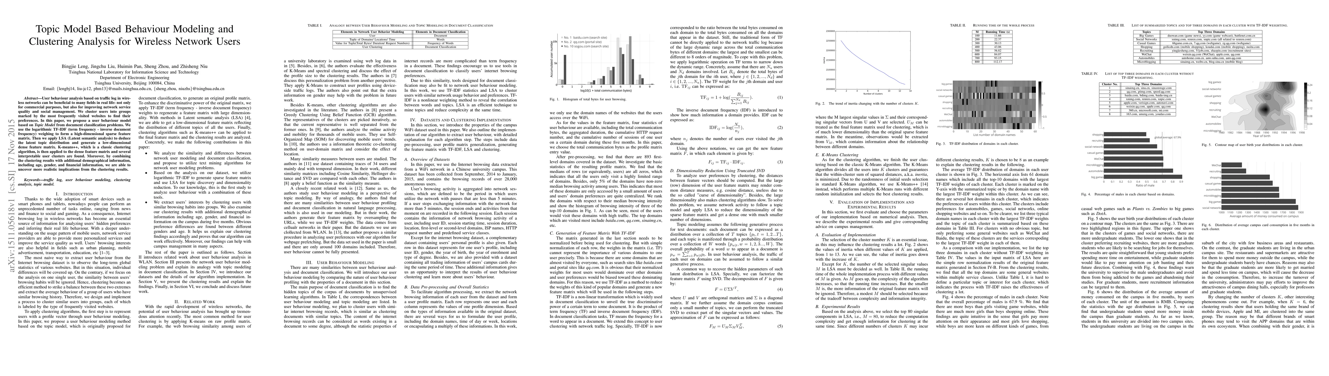 User behaviour analysis based on traffic log in wireless networks can be beneficial to many fields in real life: not only for commercial purposes, but also for improving network service quality and social management. We cluster users into groups marked by the most frequently visited websites to find their preferences. In this paper, we propose a user behaviour model based on Topic Model from document classification problems. We use the logarithmic TF-IDF (term frequency - inverse document frequency) weighing to form a high-dimensional sparse feature matrix. Then we apply LSA (Latent semantic analysis) to deduce the latent topic distribution and generate a low-dimensional dense feature matrix. K-means++, which is a classic clustering algorithm, is then applied to the dense feature matrix and several interpretable user clusters are found. Moreover, by combining the clustering results with additional demographical information, including age, gender, and financial information, we are able to uncover more realistic implications from the clustering results.