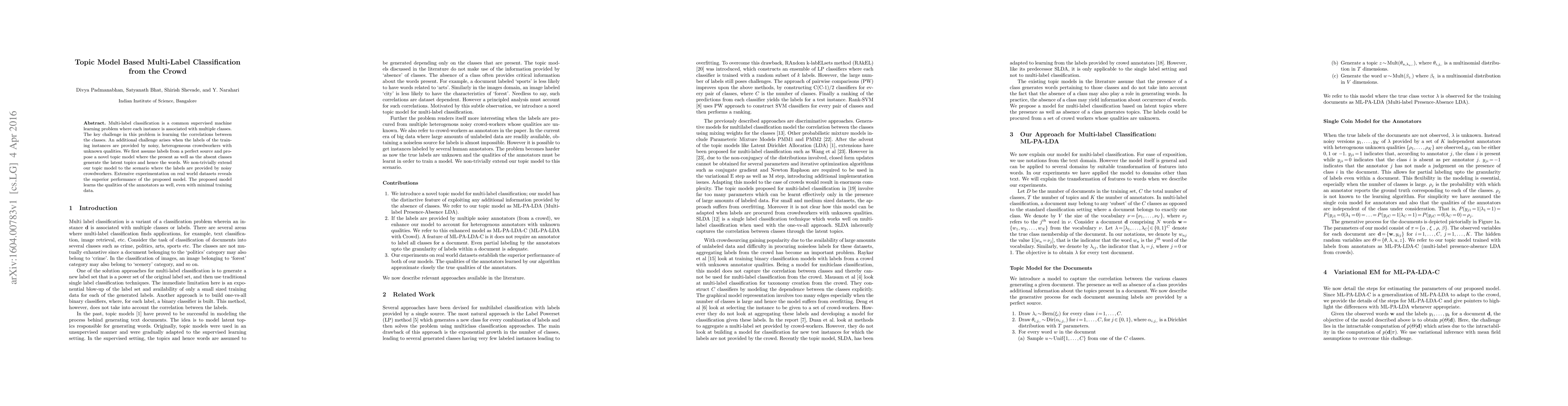 Multi-label classification is a common supervised machine learning problem where each instance is associated with multiple classes. The key challenge in this problem is learning the correlations between the classes. An additional challenge arises when the labels of the training instances are provided by noisy, heterogeneous crowdworkers with unknown qualities. We first assume labels from a perfect source and propose a novel topic model where the present as well as the absent classes generate the latent topics and hence the words. We non-trivially extend our topic model to the scenario where the labels are provided by noisy crowdworkers. Extensive experimentation on real world datasets reveals the superior performance of the proposed model. The proposed model learns the qualities of the annotators as well, even with minimal training data.