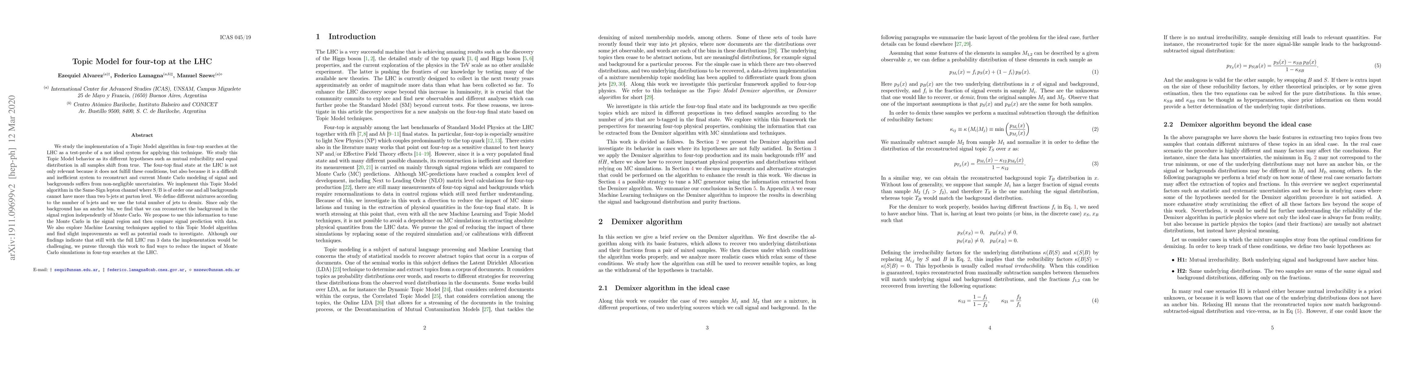 We study the implementation of a Topic Model algorithm in four-top searches at the LHC as a test-probe of a not ideal system for applying this technique. We study this Topic Model behavior as its different hypotheses such as mutual reducibility and equal distribution in all samples shift from true. The four-top final state at the LHC is not only relevant because it does not fulfill these conditions, but also because it is a difficult and inefficient system to reconstruct and current Monte Carlo modeling of signal and backgrounds suffers from non-negligible uncertainties. We implement this Topic Model algorithm in the Same-Sign lepton channel where S/B is of order one and all backgrounds cannot have more than two b-jets at parton level. We define different mixtures according to the number of b-jets and we use the total number of jets to demix. Since only the background has an anchor bin, we find that we can reconstruct the background in the signal region independently of Monte Carlo. We propose to use this information to tune the Monte Carlo in the signal region and then compare signal prediction with data. We also explore Machine Learning techniques applied to this Topic Model algorithm and find slight improvements as well as potential roads to investigate. Although our findings indicate that still with the full LHC run 3 data the implementation would be challenging, we pursue through this work to find ways to reduce the impact of Monte Carlo simulations in four-top searches at the LHC.