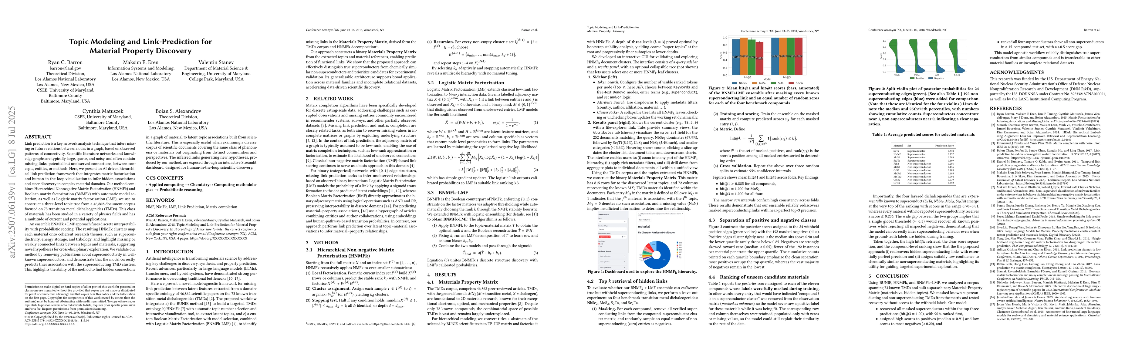 Link prediction infers missing or future relations between graph nodes, based on connection patterns. Scientific literature networks and knowledge graphs are typically large, sparse, and noisy, and often contain missing links between entities. We present an AI-driven hierarchical link prediction framework that integrates matrix factorization to infer hidden associations and steer discovery in complex material domains. Our method combines Hierarchical Nonnegative Matrix Factorization (HNMFk) and Boolean matrix factorization (BNMFk) with automatic model selection, as well as Logistic matrix factorization (LMF), we use to construct a three-level topic tree from a 46,862-document corpus focused on 73 transition-metal dichalcogenides (TMDs). These materials are studied in a variety of physics fields with many current and potential applications. An ensemble BNMFk + LMF approach fuses discrete interpretability with probabilistic scoring. The resulting HNMFk clusters map each material onto coherent topics like superconductivity, energy storage, and tribology. Also, missing or weakly connected links are highlight between topics and materials, suggesting novel hypotheses for cross-disciplinary exploration. We validate our method by removing publications about superconductivity in well-known superconductors, and show the model predicts associations with the superconducting TMD clusters. This shows the method finds hidden connections in a graph of material to latent topic associations built from scientific literature, especially useful when examining a diverse corpus of scientific documents covering the same class of phenomena or materials but originating from distinct communities and perspectives. The inferred links generating new hypotheses, produced by our method, are exposed through an interactive Streamlit dashboard, designed for human-in-the-loop scientific discovery.