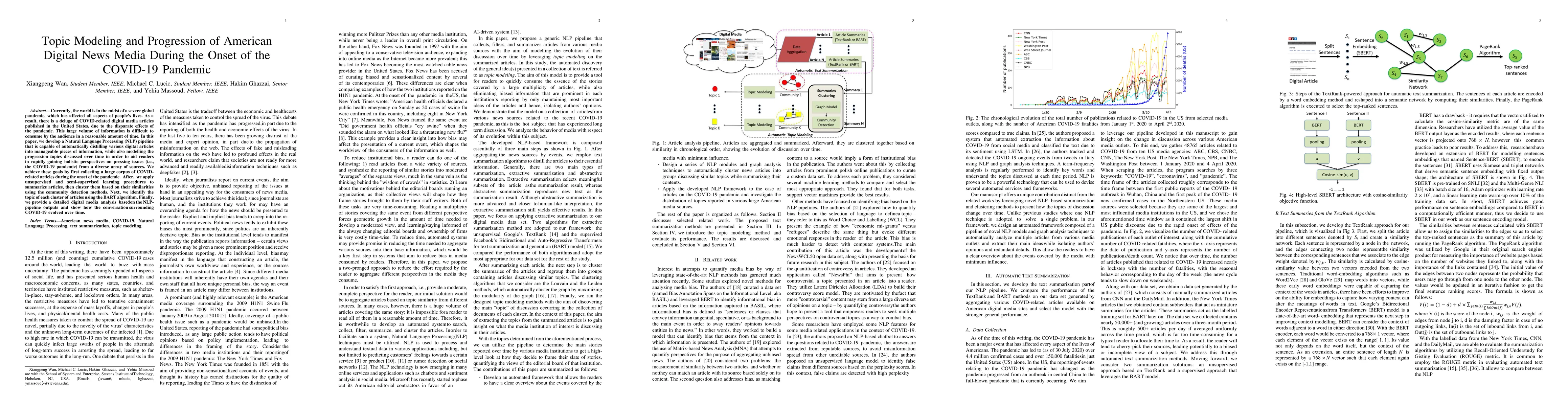 Currently, the world is in the midst of a severe global pandemic, which has affected all aspects of people's lives. As a result, there is a deluge of COVID-related digital media articles published in the United States, due to the disparate effects of the pandemic. This large volume of information is difficult to consume by the audience in a reasonable amount of time. In this paper, we develop a Natural Language Processing (NLP) pipeline that is capable of automatically distilling various digital articles into manageable pieces of information, while also modelling the progression topics discussed over time in order to aid readers in rapidly gaining holistic perspectives on pressing issues (i.e., the COVID-19 pandemic) from a diverse array of sources. We achieve these goals by first collecting a large corpus of COVID-related articles during the onset of the pandemic. After, we apply unsupervised and semi-supervised learning procedures to summarize articles, then cluster them based on their similarities using the community detection methods. Next, we identify the topic of each cluster of articles using the BART algorithm. Finally, we provide a detailed digital media analysis based on the NLP-pipeline outputs and show how the conversation surrounding COVID-19 evolved over time.