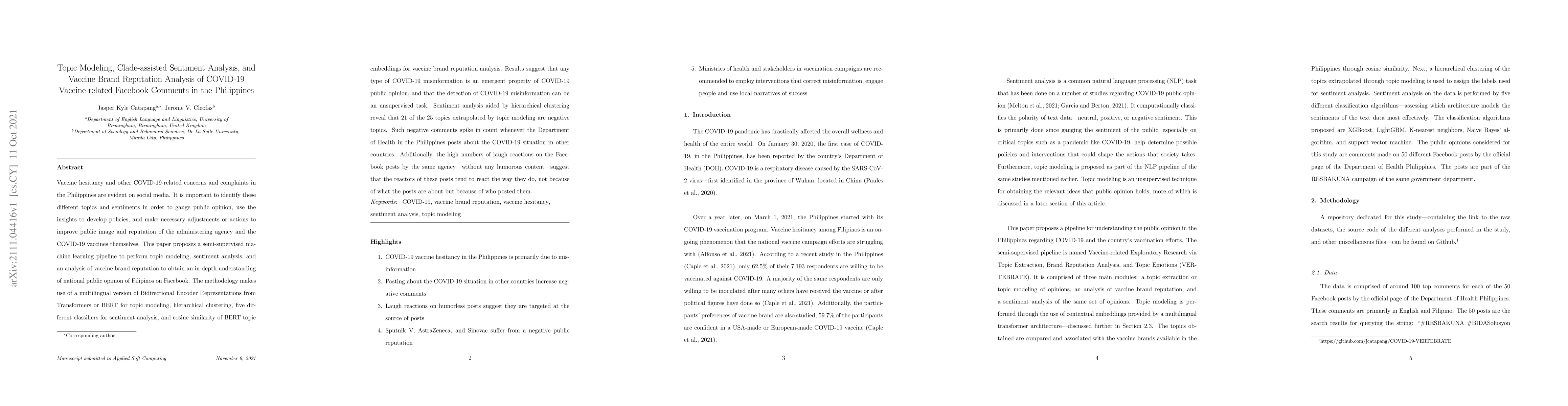 This paper utilizes a semi-supervised machine learning approach to analyze COVID-19 vaccine-related comments on Filipino Facebook, identifying topics, sentiments, and vaccine brand reputation. The analysis reveals that misinformation and negative sentiments are prevalent, especially in response to international COVID-19 updates, suggesting an influence of institutional trust on public perception.