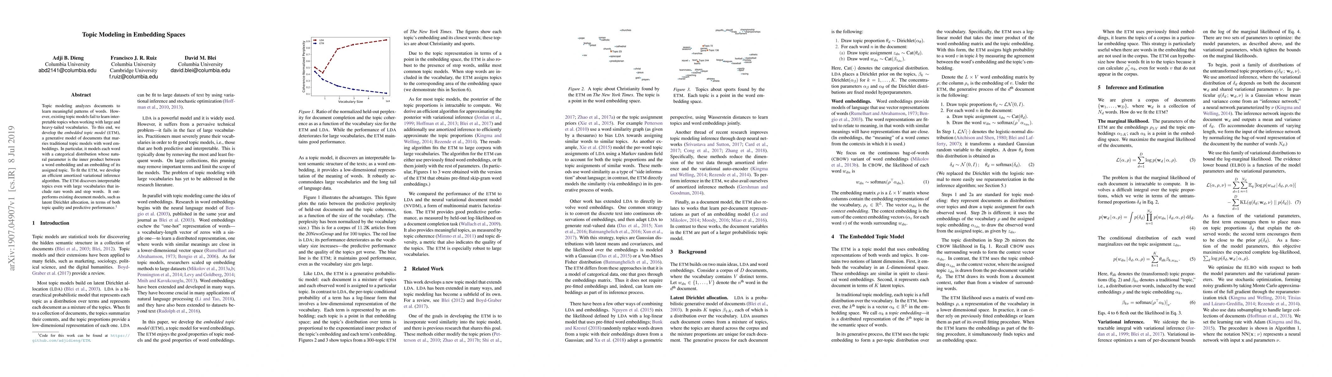 This paper introduces the Embedded Topic Model (ETM), a novel generative model that combines traditional topic modeling with word embeddings to produce interpretable topics even from large, heavy-tailed vocabularies. The ETM outperforms existing models like LDA in both topic quality and predictive performance.