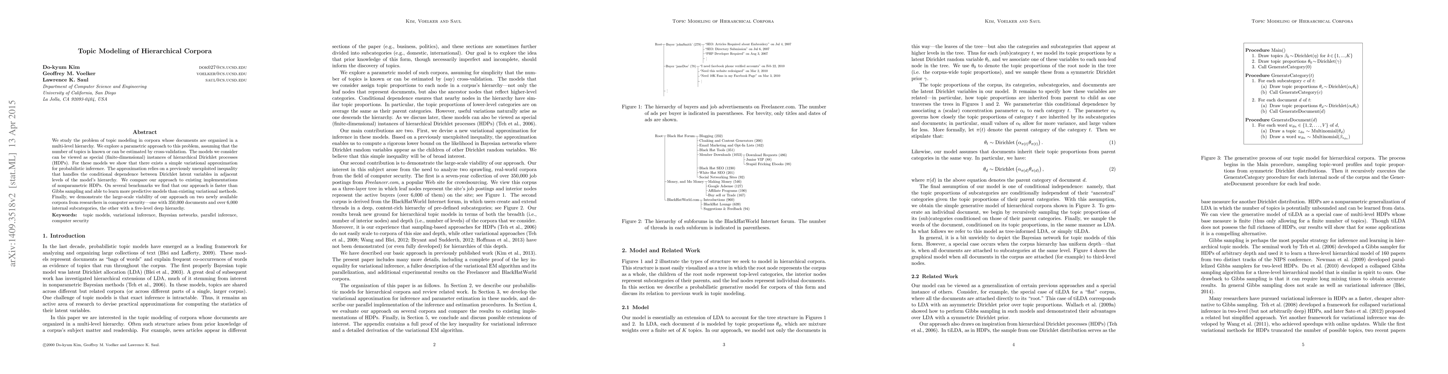 This paper proposes a parametric approach for topic modeling in hierarchical corpora, employing a variational approximation that leverages a new inequality to handle conditional dependencies. The method is faster than Gibbs sampling and more effective than existing variational methods, demonstrated on large-scale corpora in computer security.